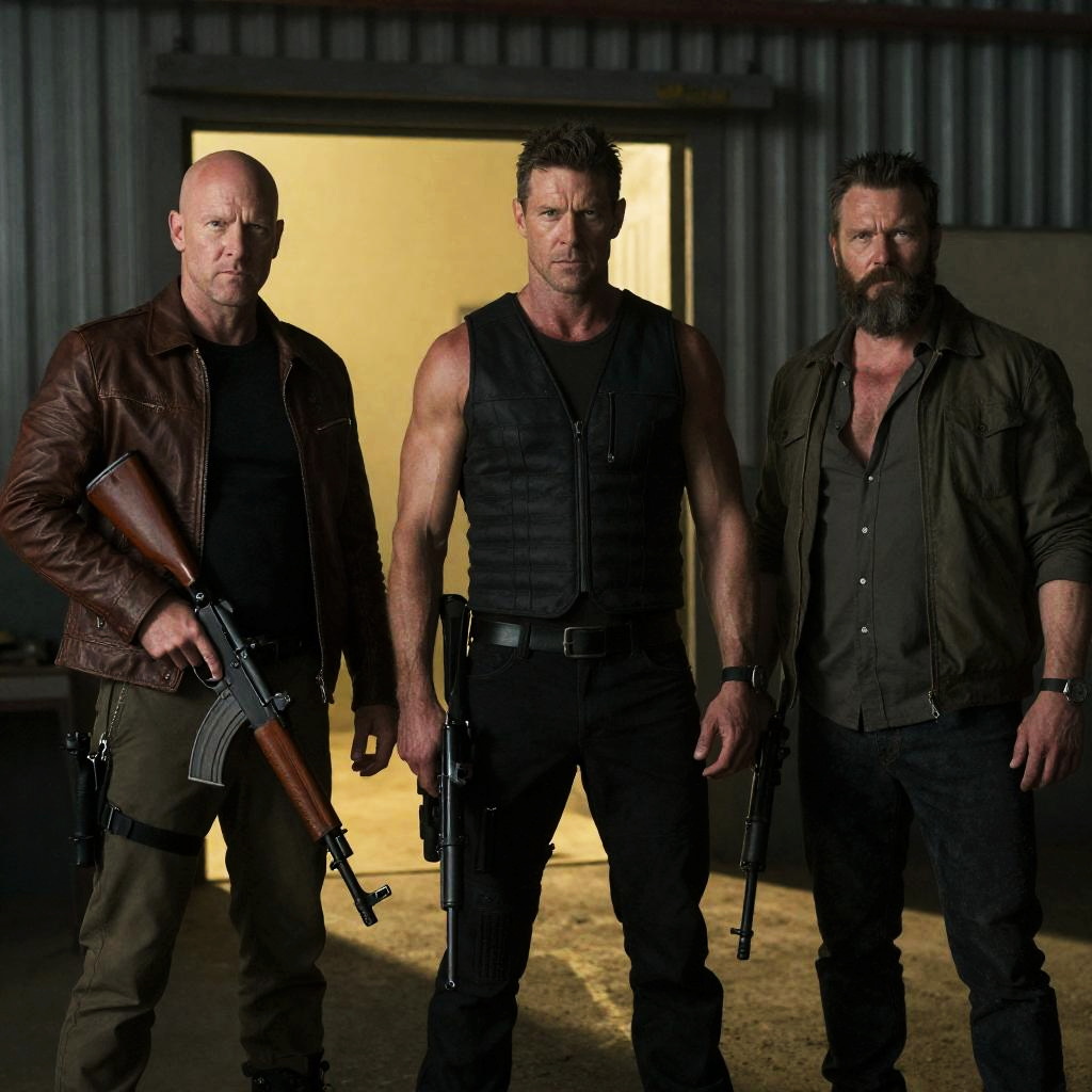 Four people in a grassy, wooded area with rusted barrels and metal pipes. Two men crouch, aiming rifles; one has dark hair, bearded, wearing a green shirt. The other is older, bald, in black. A blonde woman crouches behind them, holding a green rifle. Dense greenery in the background. Both men have focused expressions.