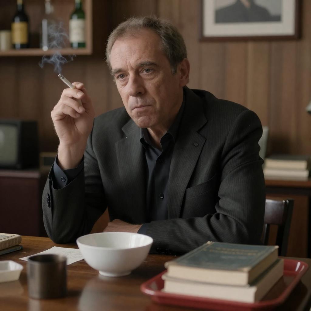 A middle-aged man with short brown hair and a slightly weathered face sits in a patterned armchair, wearing a brown shirt. He looks tired and contemplative, with a glass bottle blurred in the foreground. A red towel is draped over the chair's back. The background includes wooden furniture and shelves.