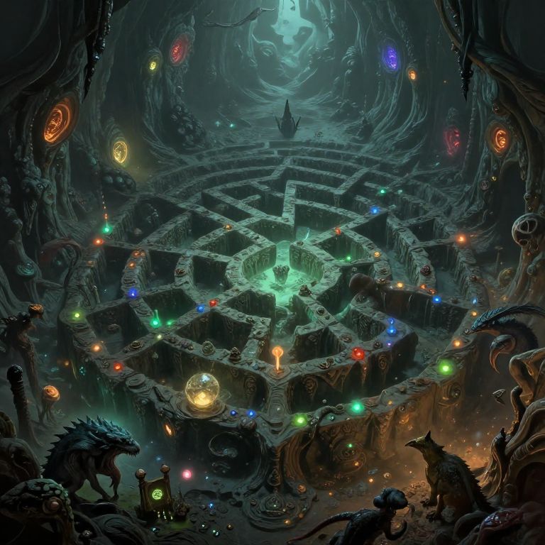 This digital artwork depicts a mystical, dimly-lit cavern with a glowing, intricate maze at its center. The maze is illuminated by colorful, floating orbs in red, blue, green, and yellow. Silhouetted creatures, including a dragon and various other mythical beasts, are gathered around the maze. The cavern walls are dark and twisted, adorned with glowing symbols and textures that add depth and mystery. At the top of the image, a faint, ethereal light emanates, casting a blue glow over the scene. The overall atmosphere is otherworldly and enchanting, with a mix of dark and vibrant colors creating a sense of magic and adventure.