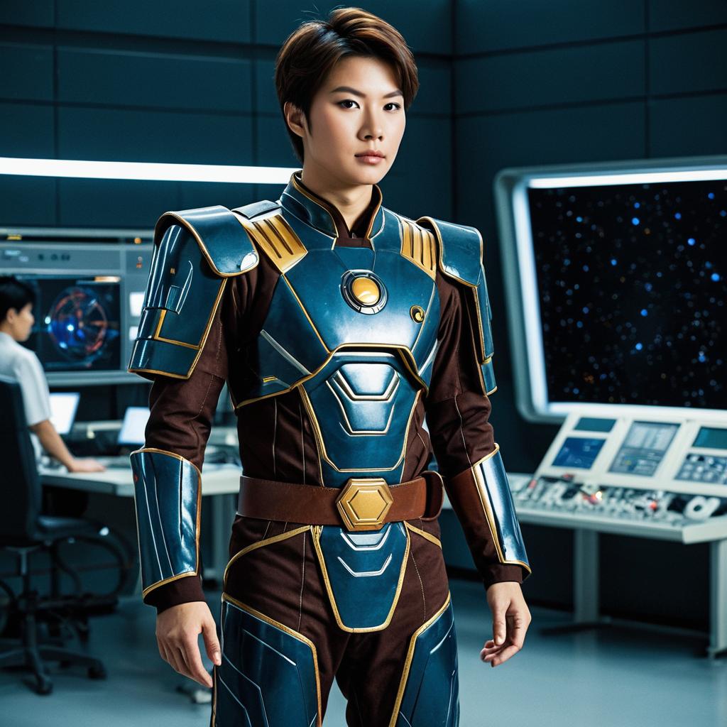 Photorealistic portrait of a young Asian woman with short black hair wearing a grey military-grade flight suit. She is equipped with a black and silver oxygen mask featuring a transparent visor, a headset, and various cables. The background is a desert landscape with a blurred horizon under daylight. The suit has patches including one with a yellow star on a blue background and another with a red and white striped design. The overall mood is serious and determined.