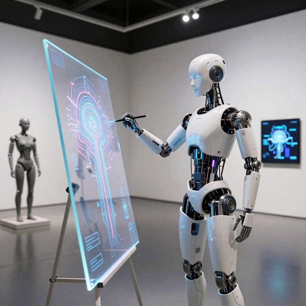 Creation AI visualized as a sleek humanoid machine with glowing neural circuits, painting on a transparent holographic canvas, in a modern minimalist art gallery filled with digital sculptures and interactive displays, showcasing the fusion of artificial intelligence and artistic expression.