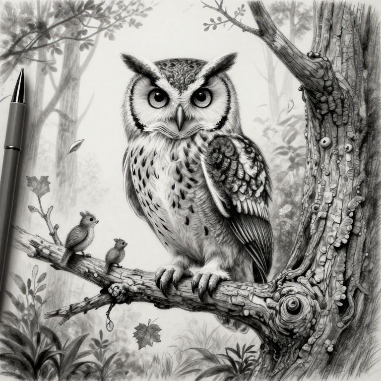 Owl drawing pictures showing a detailed graphite sketch of a wise old owl with piercing eyes, perched on a gnarled branch with intricate bark texture, surrounded by tiny woodland critters and falling leaves, evoking a mystical forest ambiance.