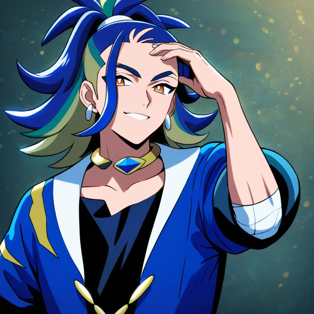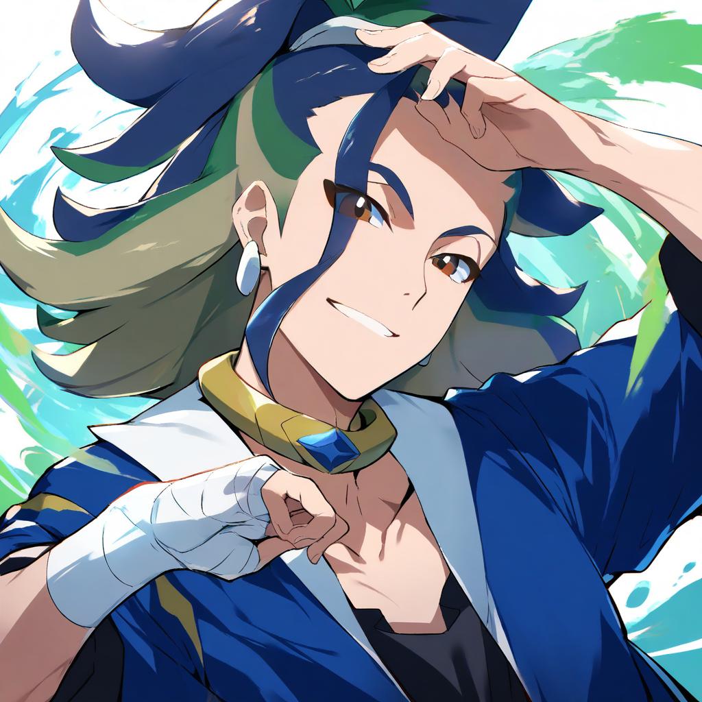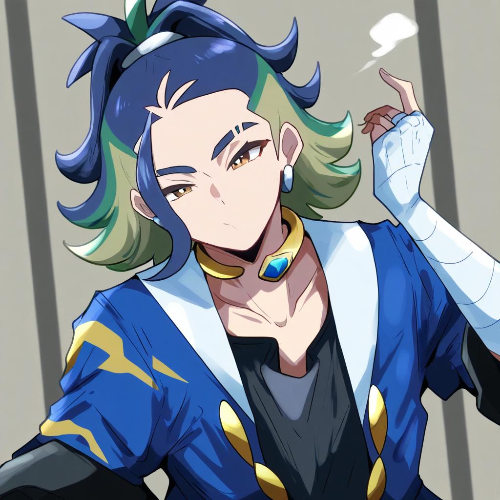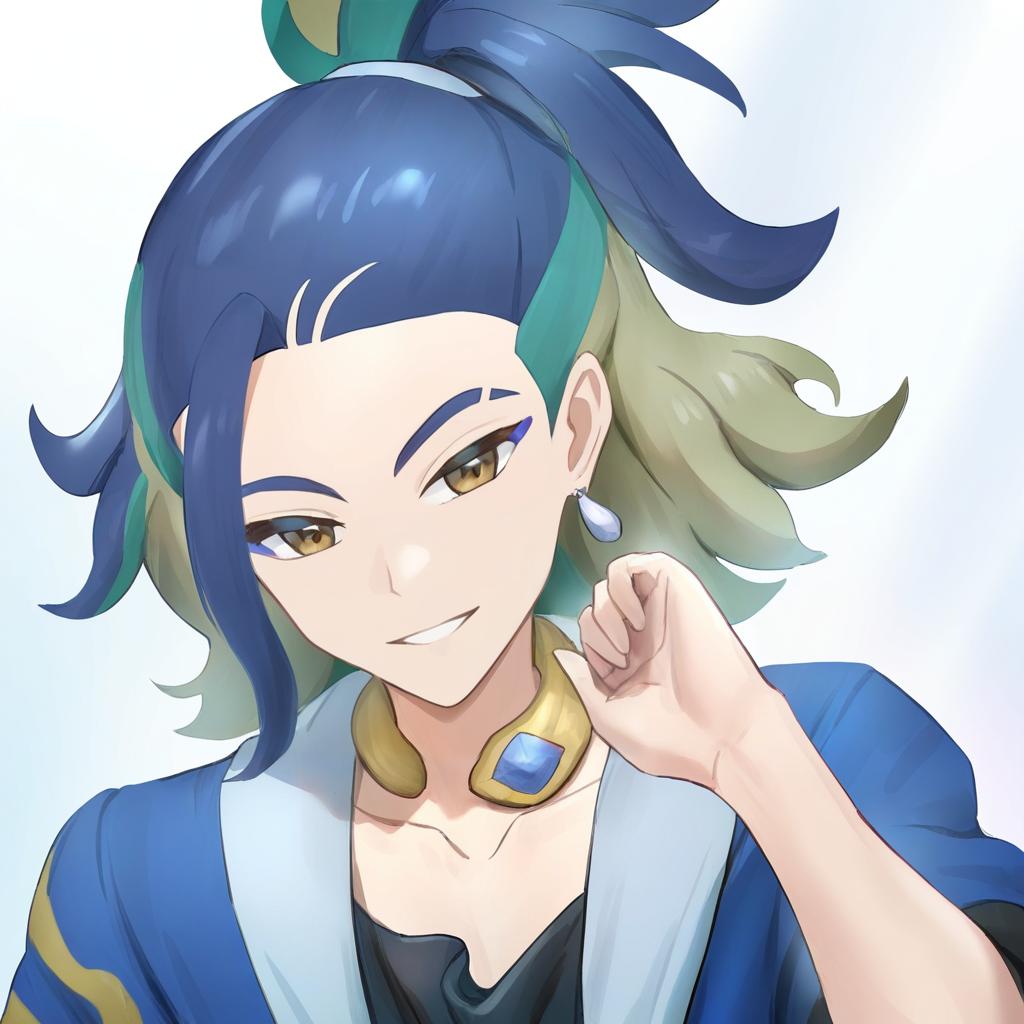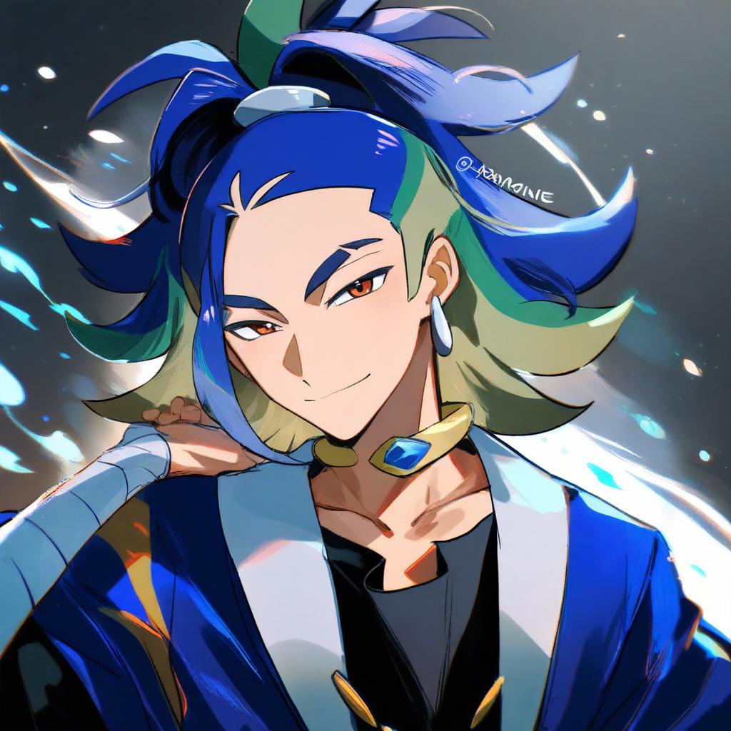 Adaman (pokemon), pokemon, 1boy, hand up, brown eyes, eyebrow cut, blue hair, multicolored hair, green hair, ponytail, collarbone, blue coat, open coat, black shirt, collar, neck ring, earrings, arm wrap, by artist kadeart, animagine