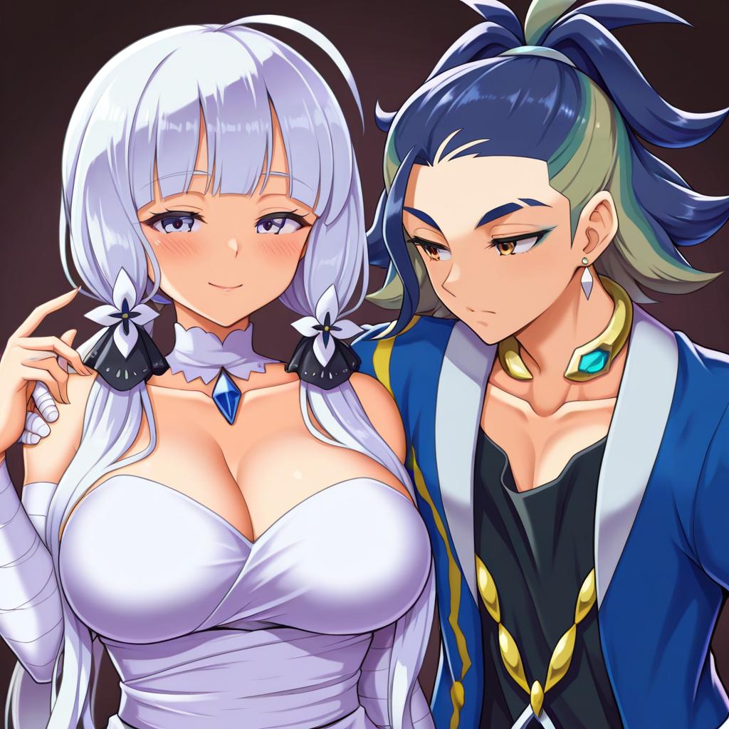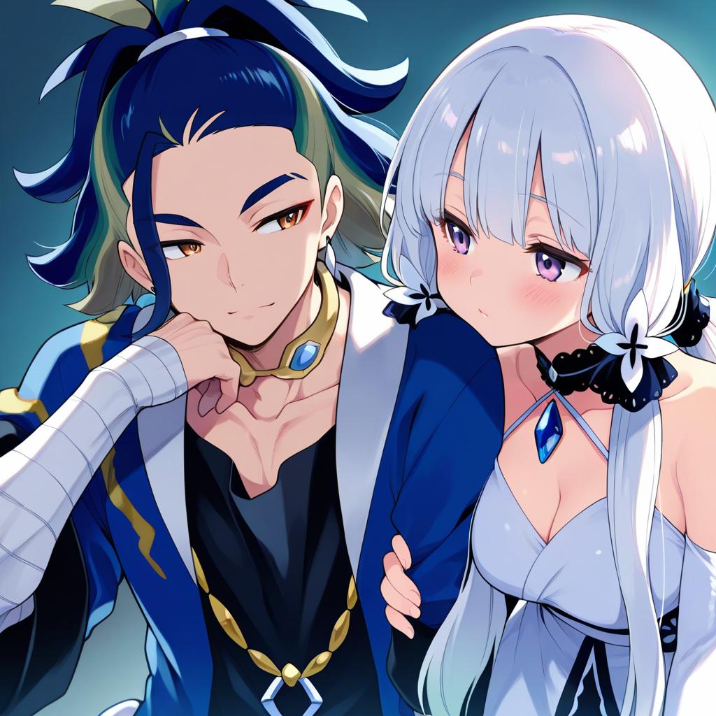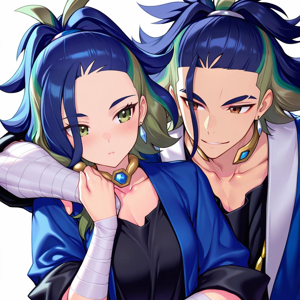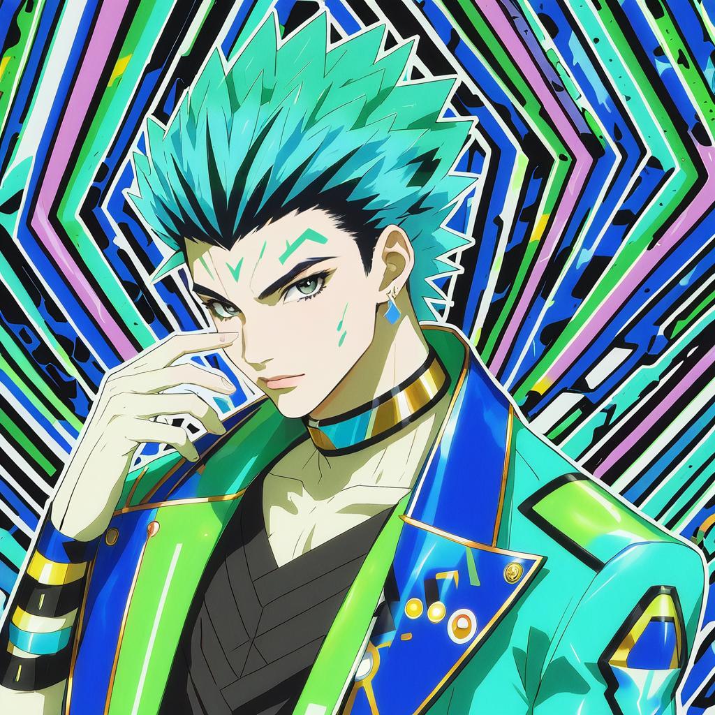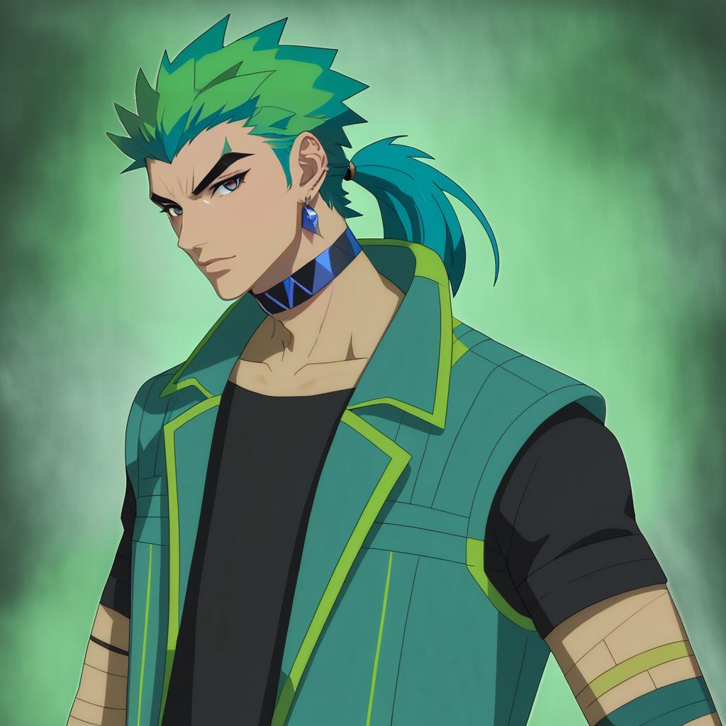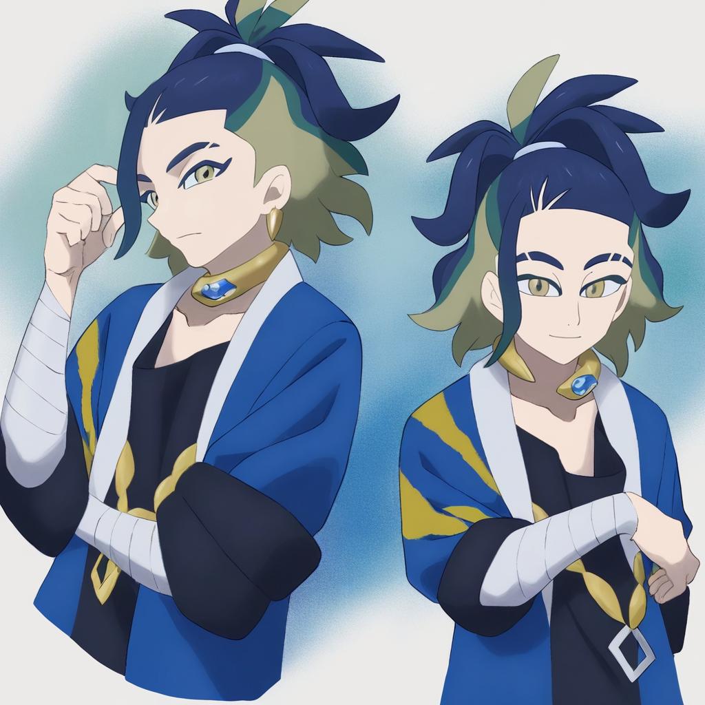 Adaman (pokemon), pokemon, 1boy, hand up, brown eyes, eyebrow cut, blue hair, multicolored hair, green hair, ponytail, collarbone, blue coat, open coat, black shirt, collar, neck ring, earrings, arm wrap, by artist kadeart, animagine