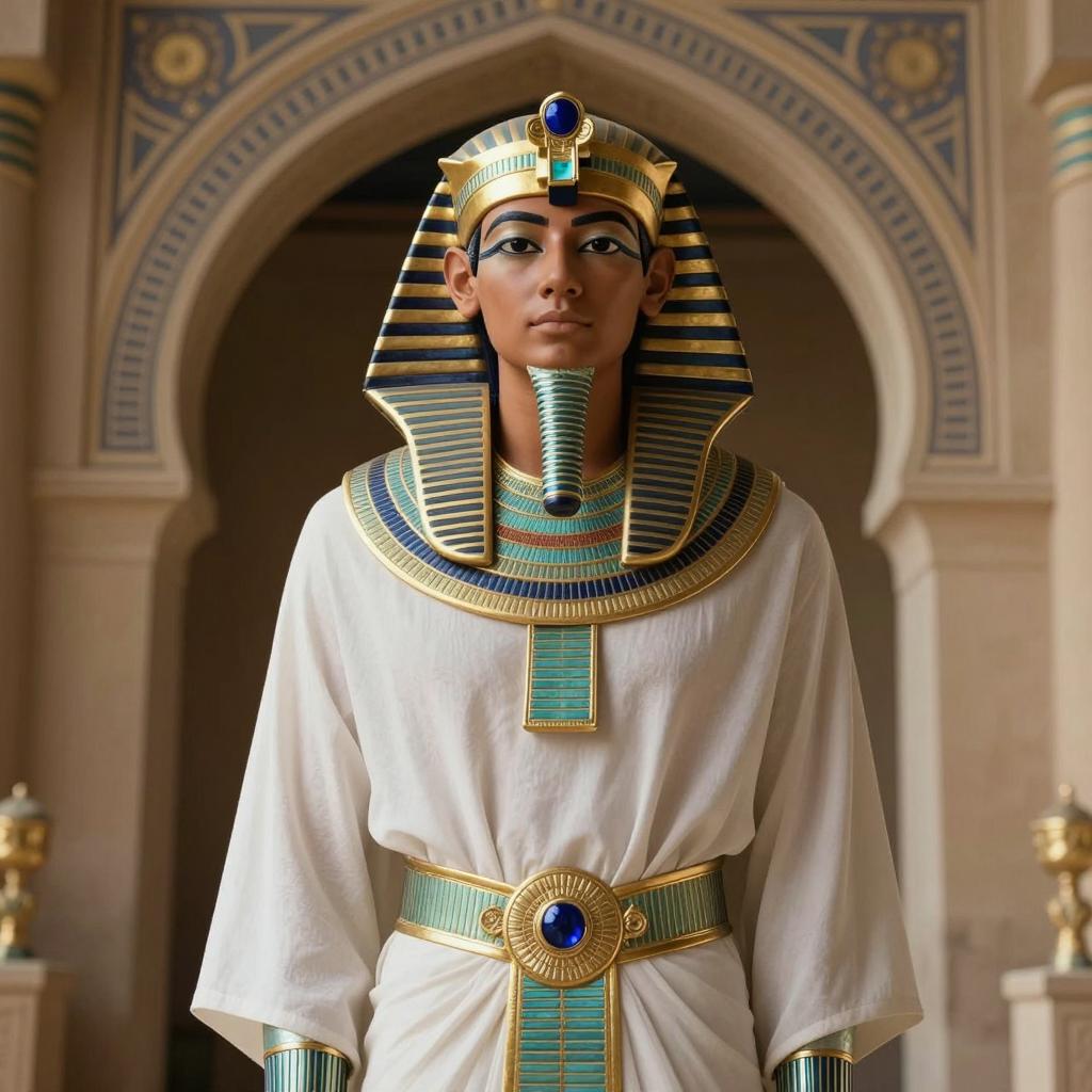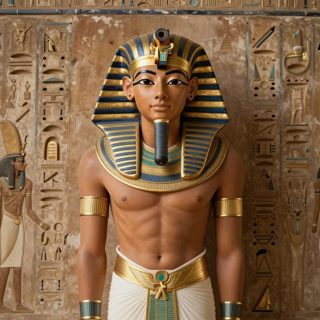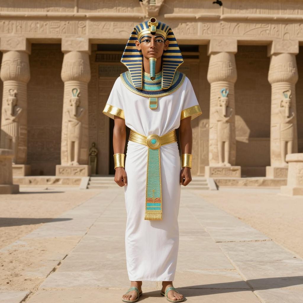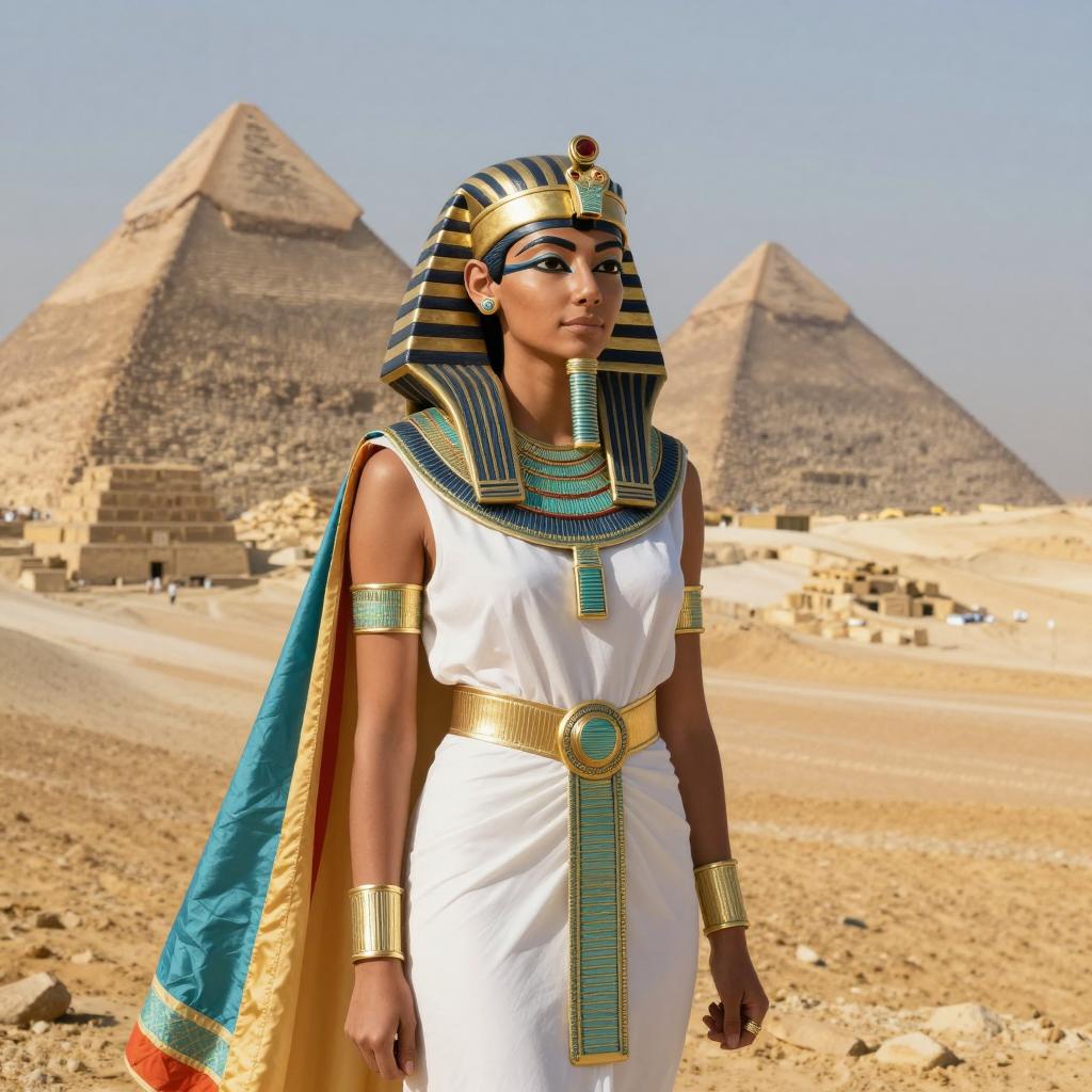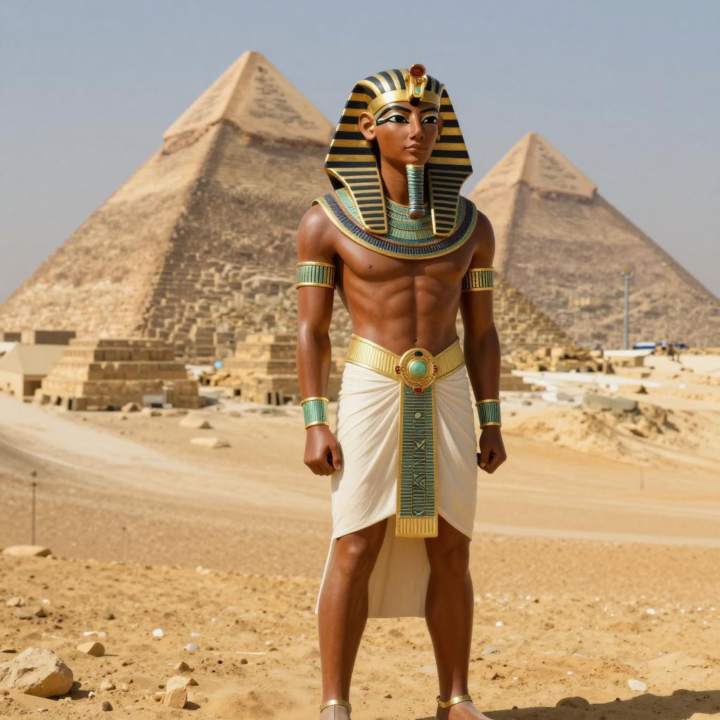 All powerful pharaoh costume, digital art, realistic, ancient Egyptian pharaoh, muscular, dark brown skin, serious expression, Nemes headcloth with black and gold stripes, gold and black collar, gold armlets, chest plate with geometric patterns, black and gold kilt, standing in front of pyramids, sandy background, sunlight, detailed ures, photorealistic style, CGI, historical attire, symmetrical composition, clear focus, central figure, warm color palette