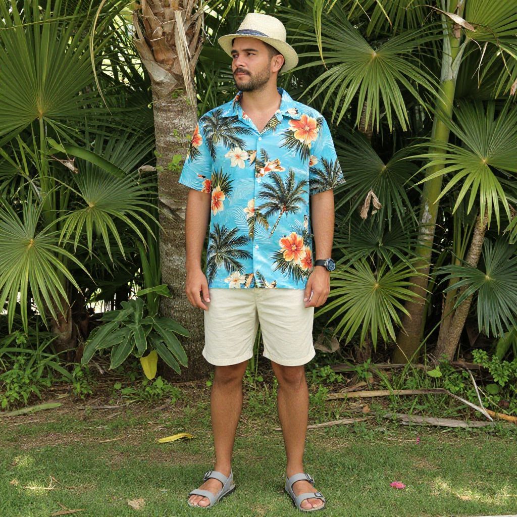 Photograph of a young man standing outdoors on a grassy area. He has a medium build, light brown skin, and a short, dark beard. He wears a white sunhat, a blue Hawaiian shirt with orange and white floral patterns, cream-colored shorts, and gray sandals. His left wrist has a black watch. The background is lush with tall, green palm trees and dense foliage. The sunlight filters through the leaves, casting dappled shadows on the ground. The image has a bright, vibrant color palette and a casual, tropical vibe.