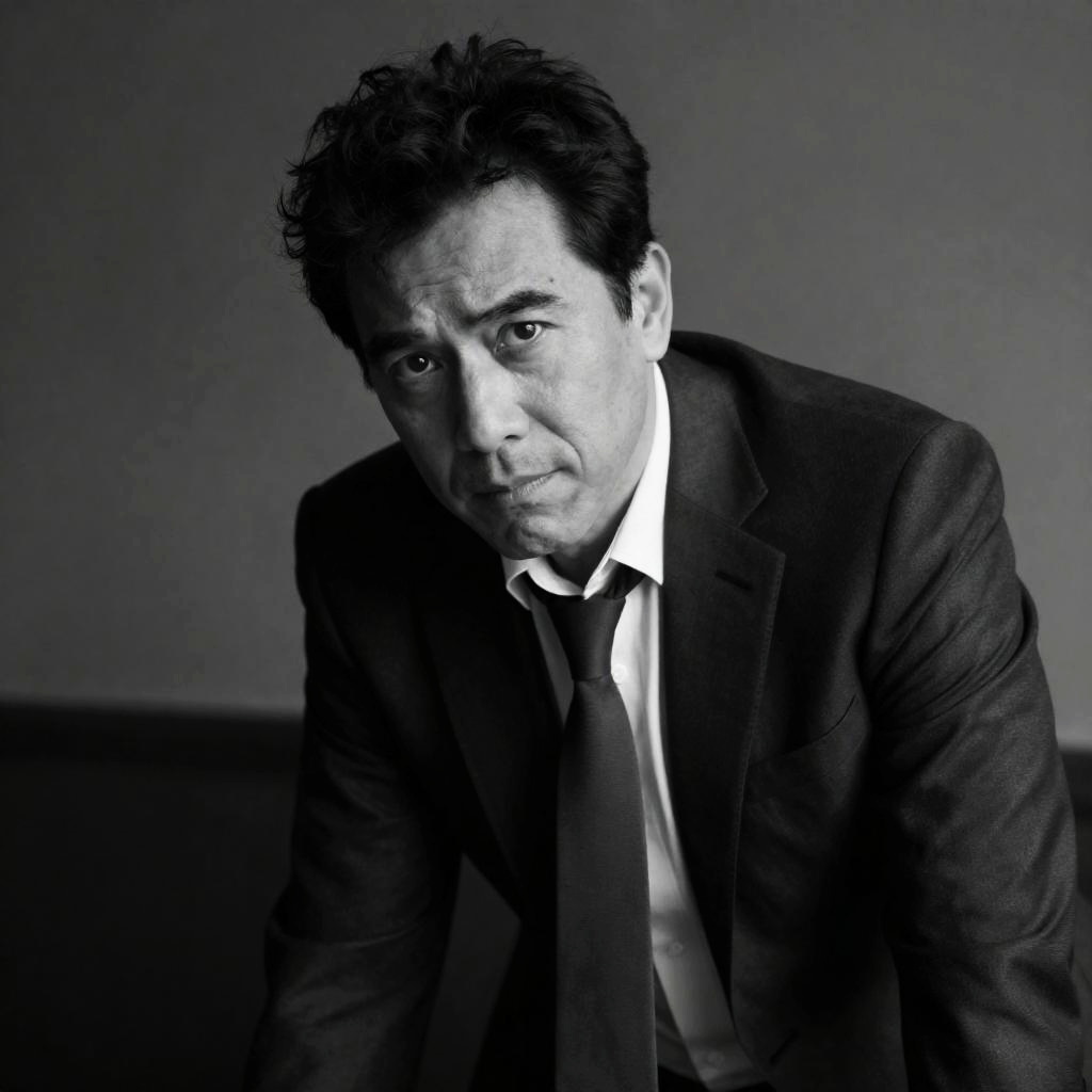 Man in yellow blazer, white pants, brown shoes, and glasses sits on large marble bench. He has a red rose in his lapel and crosses his legs. Dark background, spotlight on him. Serious expression. Marble bench with gray veins.