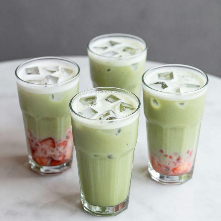 Three strawberry matcha lattes in glasses with ice.