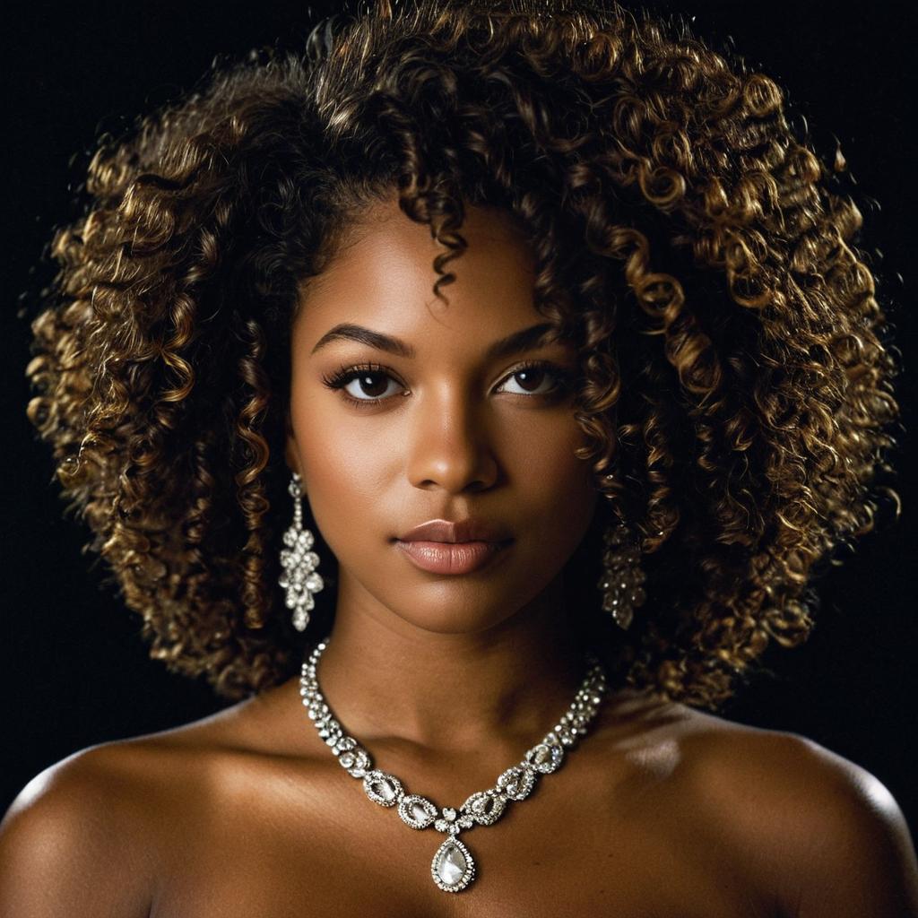 Portrait of an elegant dark-skinned woman with short black hair and shaved sides, adorned with large hoop earrings. She has a detailed floral tattoo on her left arm and is wearing a strapless black bra. The image focuses on her upper body, capturing her confident gaze and smooth skin against a dark background.
