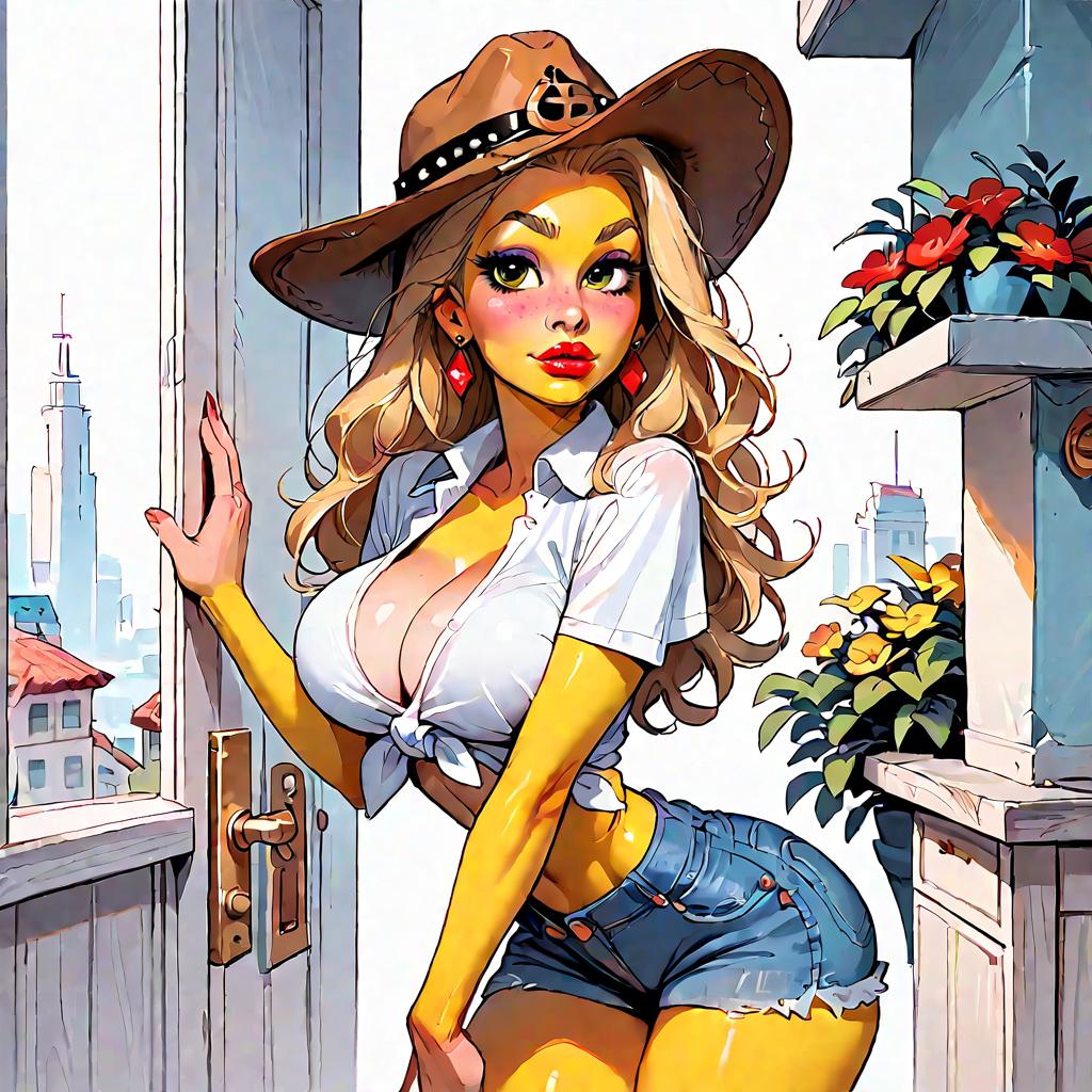 Score_9, score_8_up, score_7_up, zPDXL, four fingers, circle eyes, overbite, dot pupil, source_cartoon, toony, theSimpsonsstyle, yellow skin, 1girl, blonde hair, long hair, bimbo, red lipstick, puffy lips, white tied shirt, short sleeves, denim shorts, midriff, cowboy hat, big breasts, cleavage, narrow waist, wide hips, standing, looking at viewer, oudoor, city street
