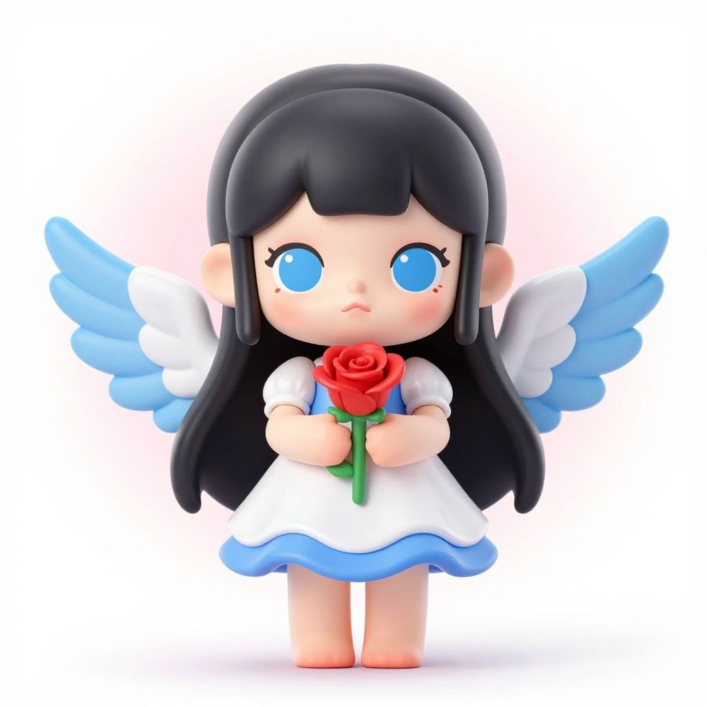3D rendered figure of a super cute magical winged creature with large blue watery eyes and long black hair parted in the middle with neat bangs. The doll wears a white and blue dress with delicate puff sleeves and has large blue and white wings spread wide. It holds a detailed red rose flower, standing on a pure white background with a soft pink gradient, designed in a Pop Mart style as a collectible blind box toy.