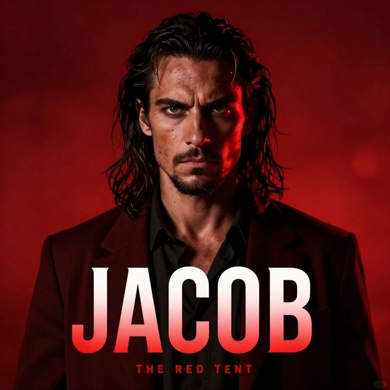 Mysterious figure \"JACOB\" from *The Red Tent* stands against a crimson backdrop, his stern expression highlighted by dramatic lighting and bold text overlay.