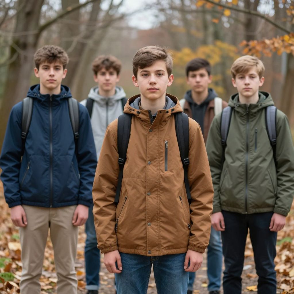 Photograph of five teenage boys standing in a forest during autumn. The central boy, with short brown hair, wears a brown jacket, blue jeans, and a black backpack. Surrounding him are four other boys, with varying hair colors and styles, dressed in hooded jackets and backpacks. The background features blurred trees with orange and brown leaves, creating a seasonal, overcast atmosphere. The boys have neutral expressions, and the ground is covered in fallen leaves. The image has a slightly enhanced, almost surreal quality, with vivid colors and sharp details.