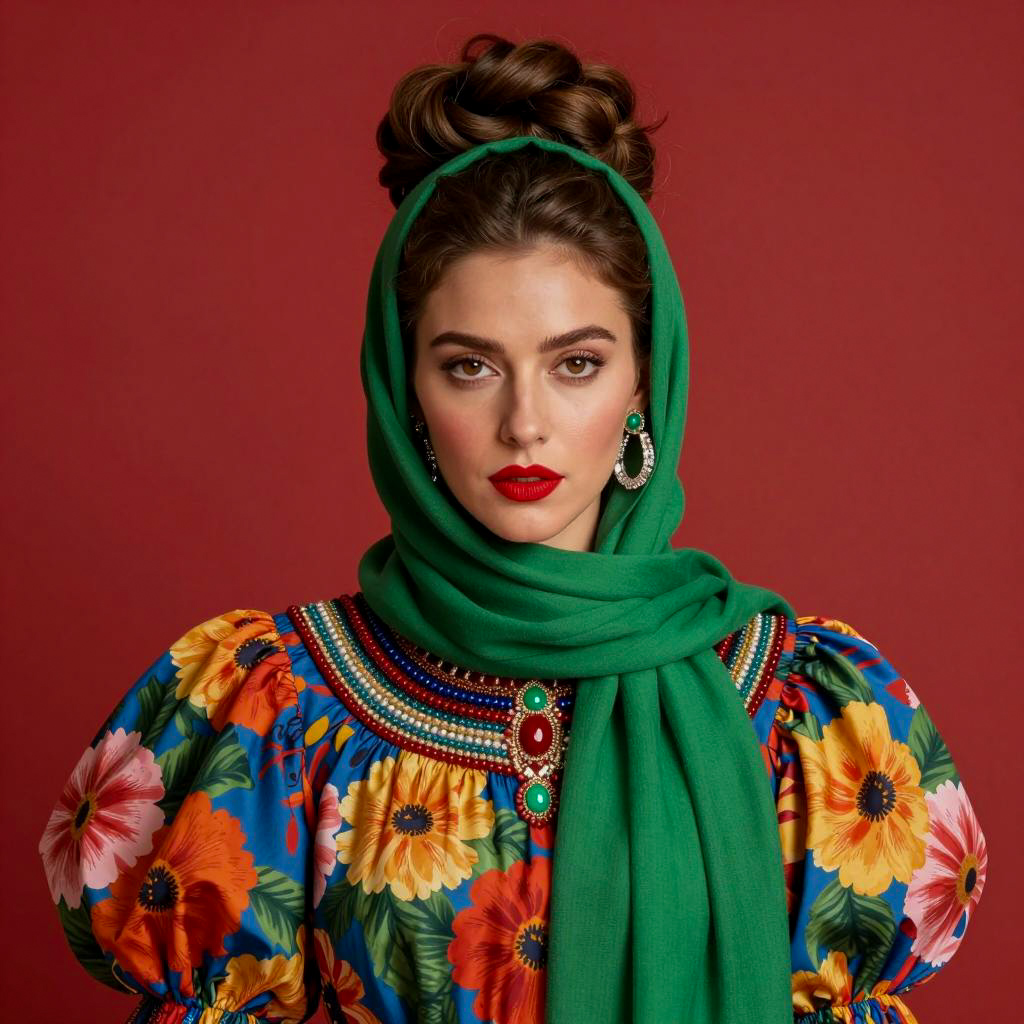 Close-up portrait of a woman with medium brown skin and dark brown hair wearing a white headscarf with black polka dots and green trim. She has full lips and defined, arched eyebrows. Her right hand, decorated with red nail polish and a large blue ring, touches her lips. The background is a soft beige color.