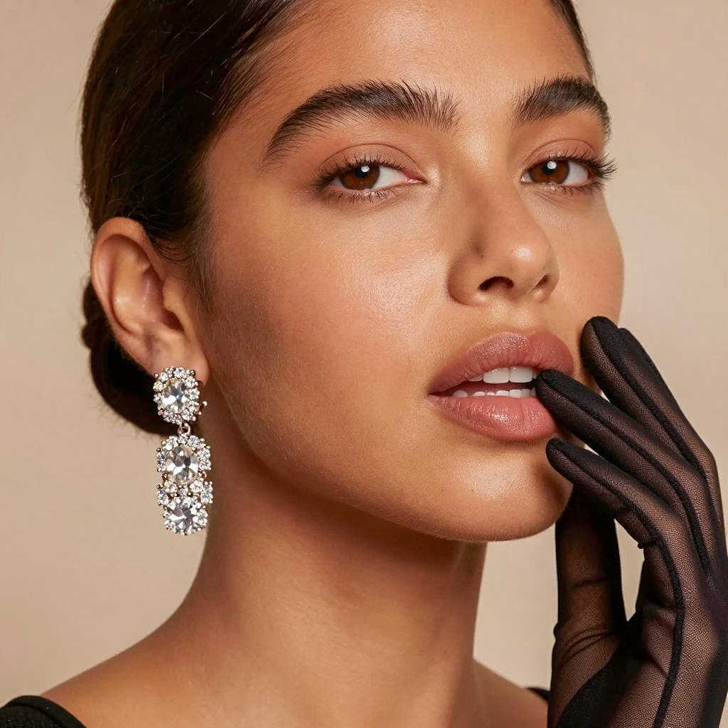 Photograph of a woman with medium brown skin, dark brown hair, and full lips. She wears a white headscarf with black polka dots and green trim. Her right hand, with red nail polish, touches her lips. She has a large blue ring on her index finger and a smaller ring on her pinky. Her eyes are half-open, and she has defined, arched eyebrows. The background is blurred beige and brown.