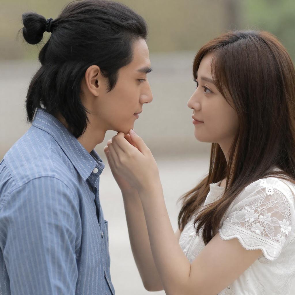 Photograph of a man and woman in an intimate moment. Man with long black hair in a bun, wearing a blue striped shirt, looks down. Woman with long brown hair, wearing a white lace top, gently touches his chin. Both have soft, focused expressions. Blurred outdoor background with warm lighting.