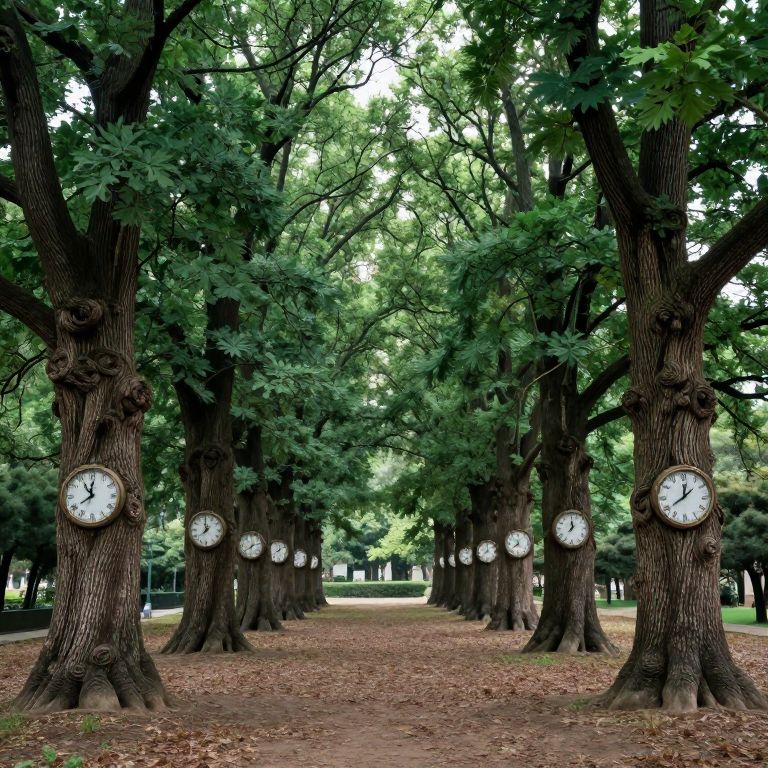 A surreal grove of ancient trees stands in perfect symmetry, each adorned with a clock face embedded in its gnarled trunk, where time intertwines with nature in an ethereal, timeless courtyard.