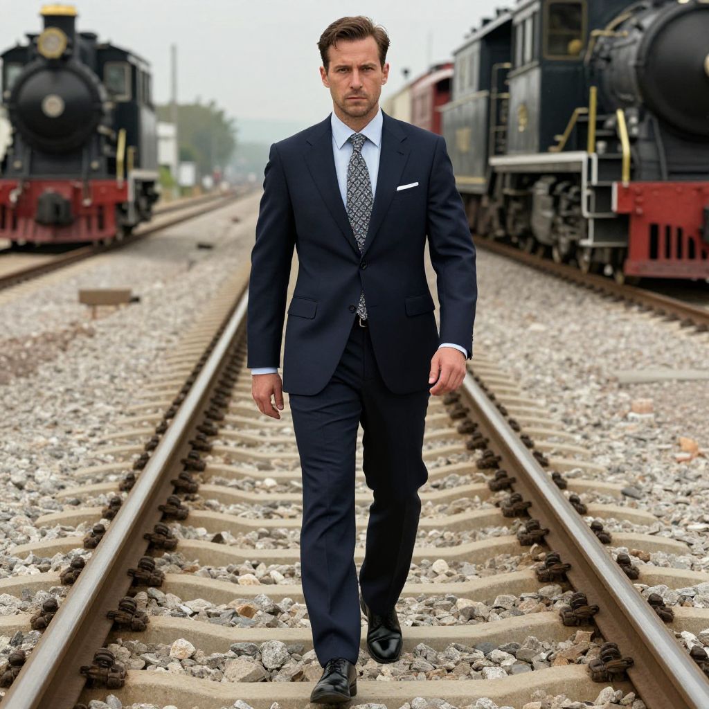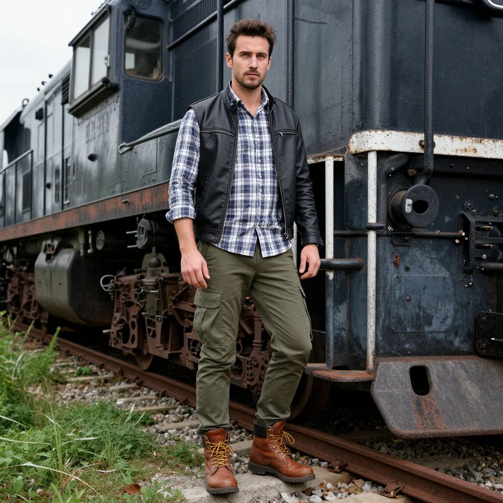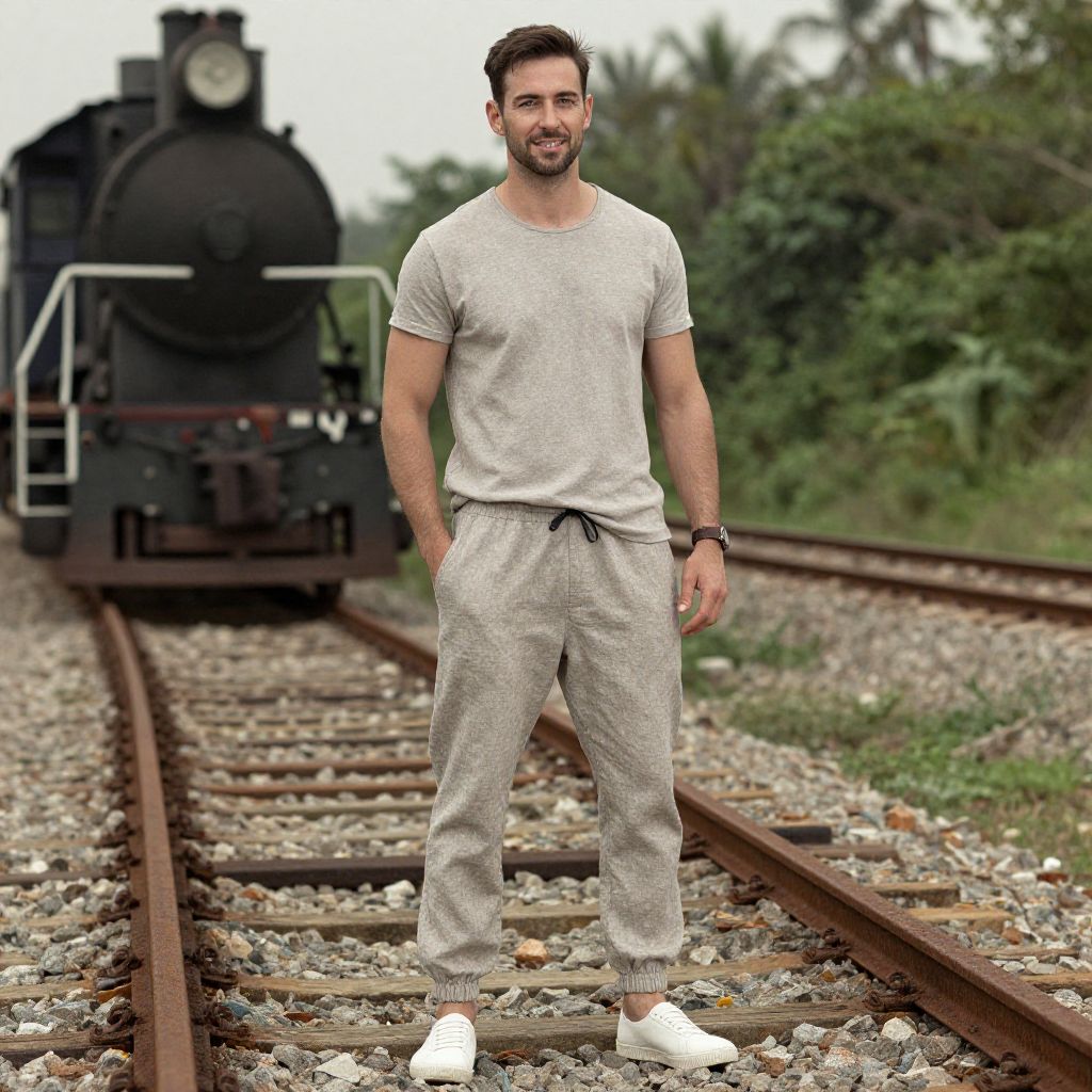 A man, linen blend joggers, light taupe, casual elegance, vintage locomotives, rusted tracks, lush green surroundings, hand-tinted photograph, relaxed smile. Man has masculine face and piercing eyes