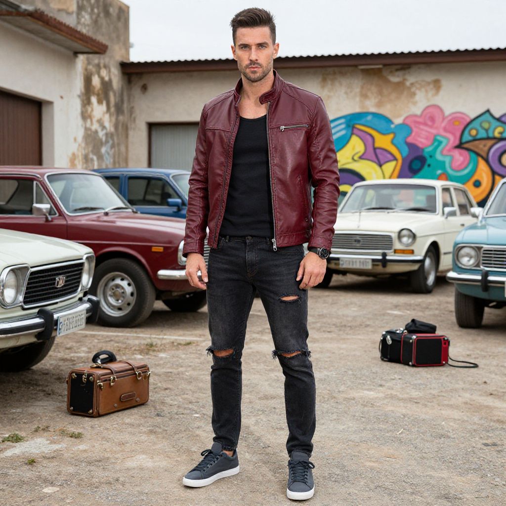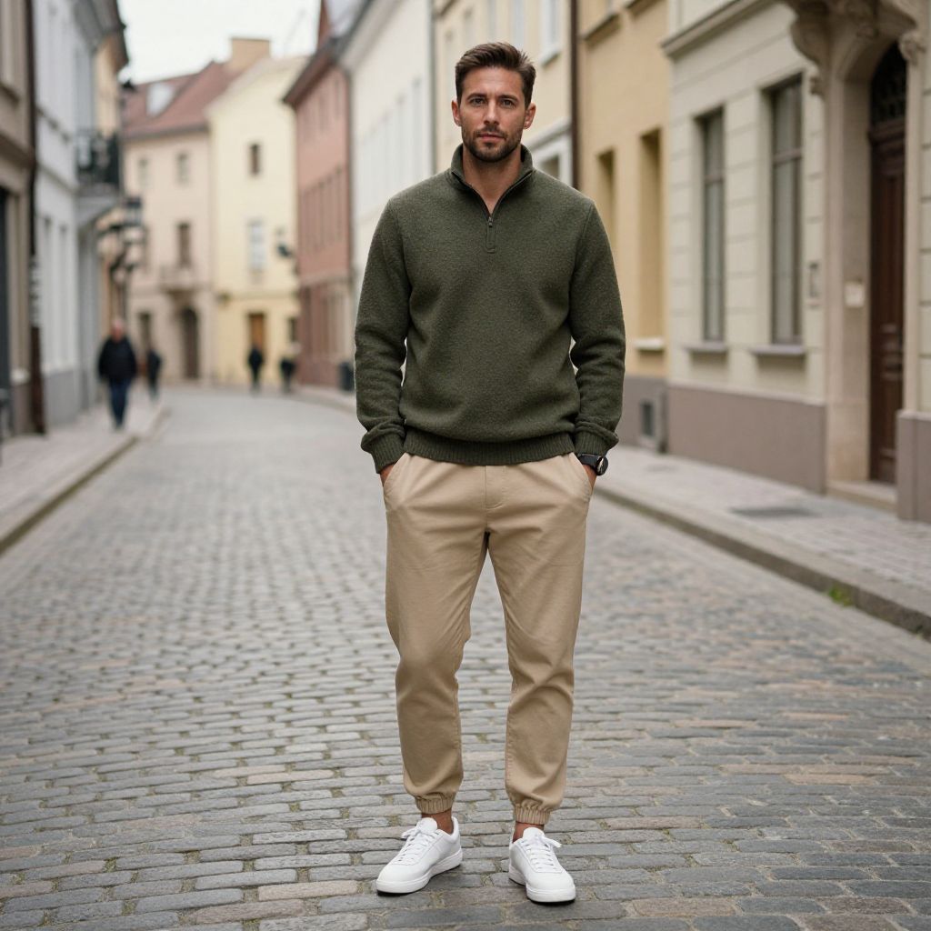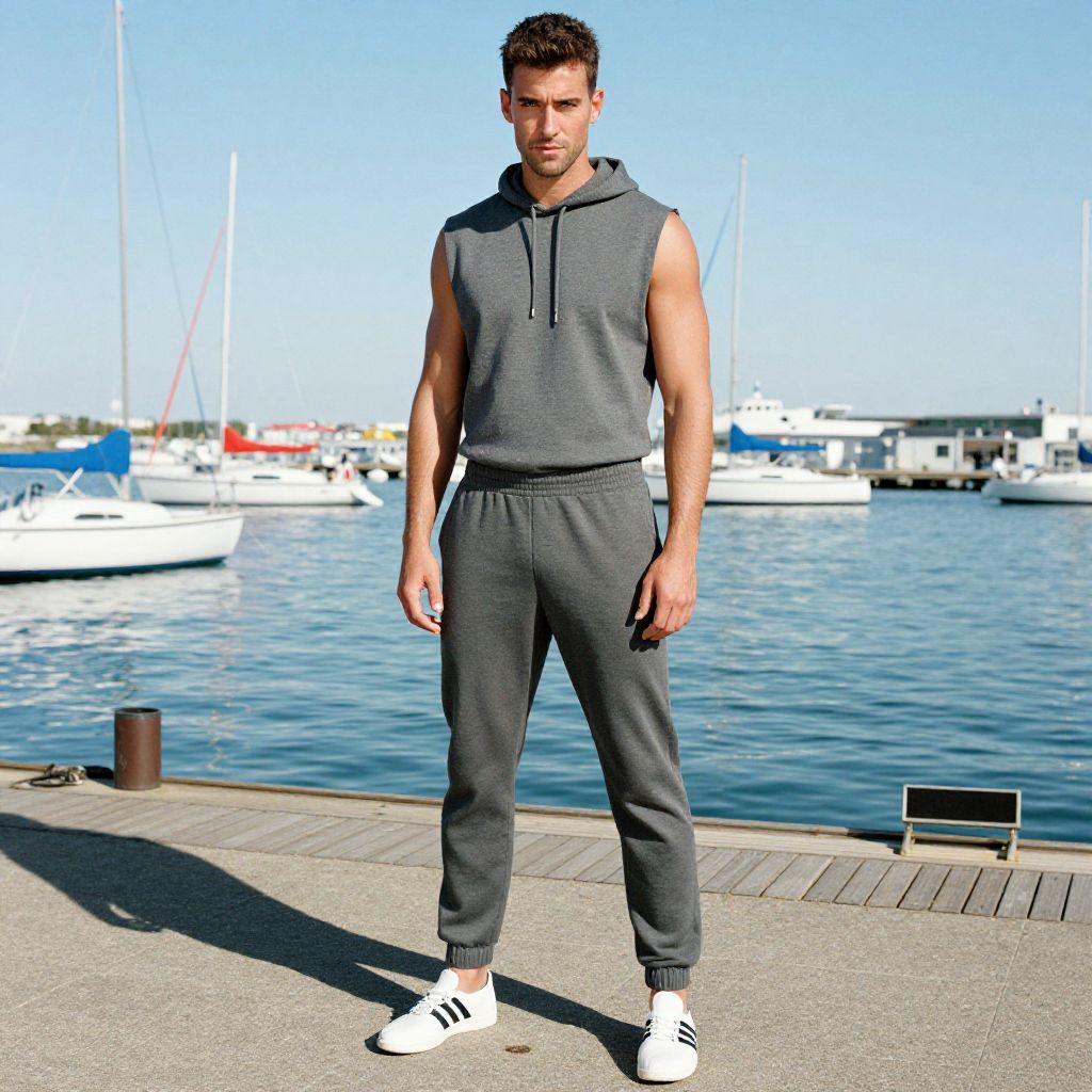A man, linen blend joggers, light taupe, casual elegance, vintage locomotives, rusted tracks, lush green surroundings, hand-tinted photograph, relaxed smile. Man has masculine face and piercing eyes