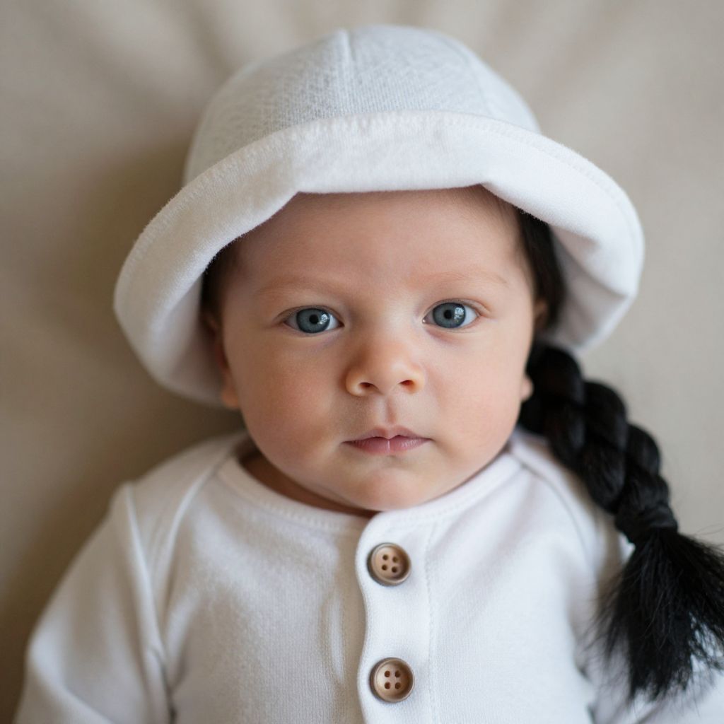 Photograph of a baby with blue eyes, fair skin, wearing a white hat and matching buttoned shirt, with a black braid.
