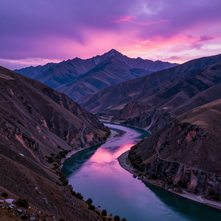 Photograph of a stunning mountainous landscape at sunset. A winding river with reflective, pink-tinged water cuts through the center, bordered by rugged, dark purple and brown mountain slopes. The sky is a gradient of pink, purple, and blue hues, casting a surreal glow over the peaks. Sparse vegetation and rock formations are visible on the lower slopes. The scene is serene and majestic, capturing the natural beauty and dramatic lighting of the mountains and river.