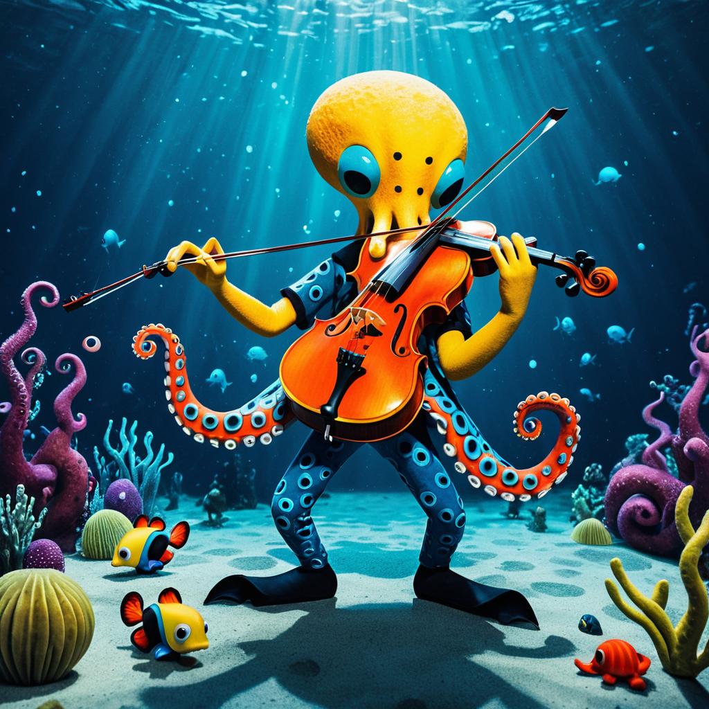 Lowbrow art of an octopus playing the violin, influenced by Joan Miró, in a surreal underwater concert hall, whimsical and vibrant, playful pose, bright colors, soft lighting, surreal and joyful vibe