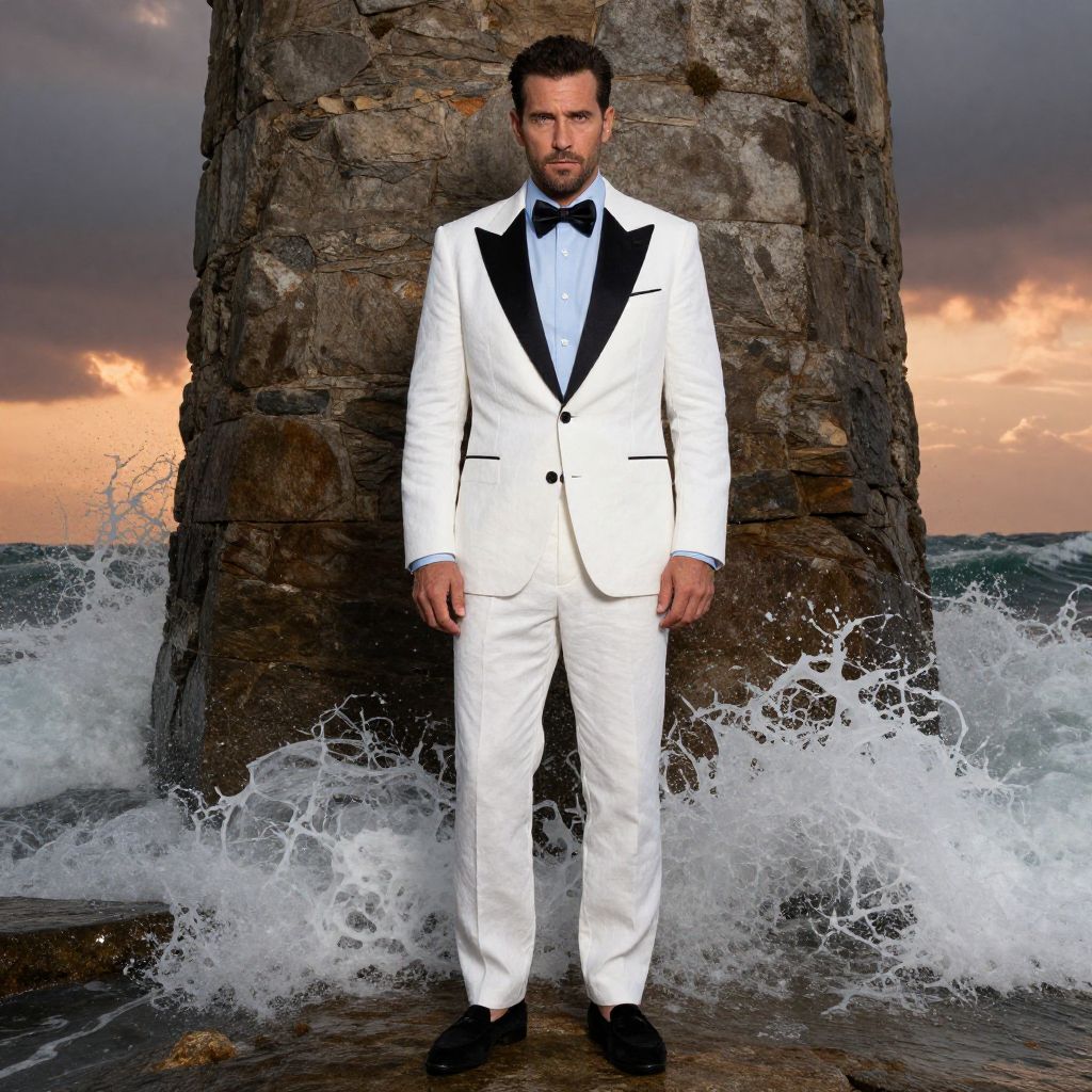 A man, white linen suit, black velvet lapels, light blue dress shirt, black bow tie, black suede loafers, rustic stone tower, crashing waves below, dramatic sunset sky, cinematic film style, confident expression. Man has masculine face and piercing eyes
