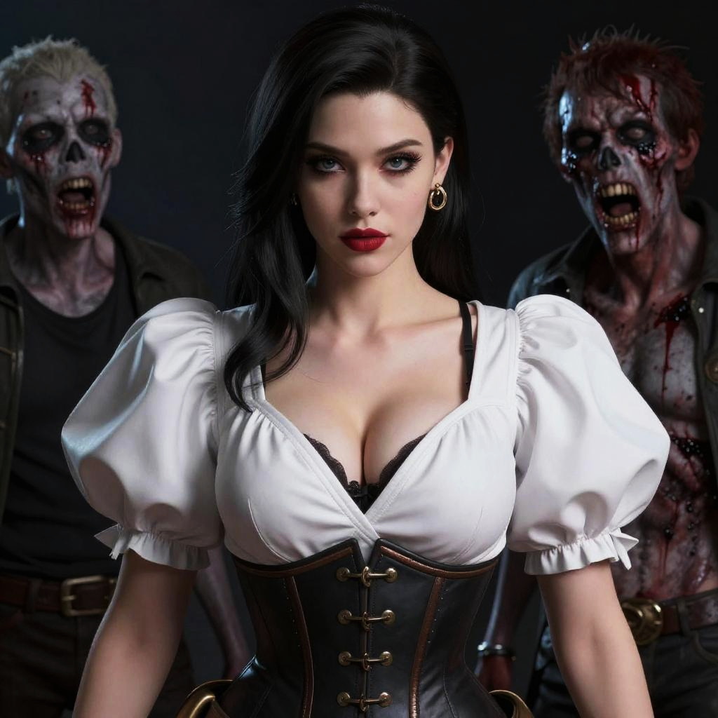 (masterpiece), (best quality), HDR, intricate detail, 1girl, solo focus, skindentation, perfect face, puffy face, beautiful face, big eyes, puffy eyes, perfect eyes, eyelashes, sarah fortune, league of legend, miss fortune, showy shoulder, large breasts, large white sleeves, sexy, black corset, showy belly, red lips, black bra, gold round earring, look at the viewer, large hips, white shirt, zombie, horror \(theme\), (realistic:1.4), 1boy, male focus, blood, teeth, simple background, black background, open mouth, upper body, shirt, full body, looking at viewer, standing