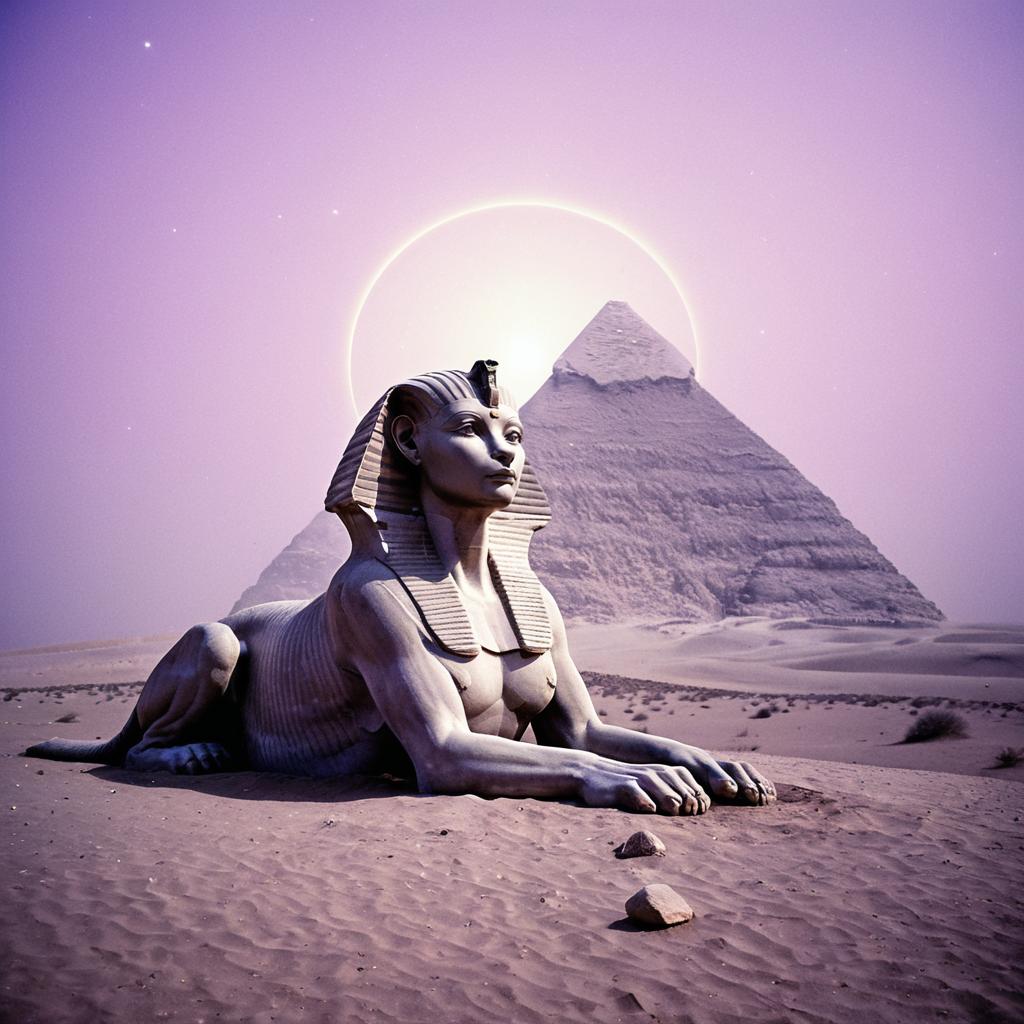 A surreal and enigmatic sphinx with a golden mane reclining in a glowing lilac-hazed desert. The background features a large pyramid under a soft, mystical light that enhances the dreamy, otherworldly atmosphere with a blend of vintage and futuristic aesthetics.