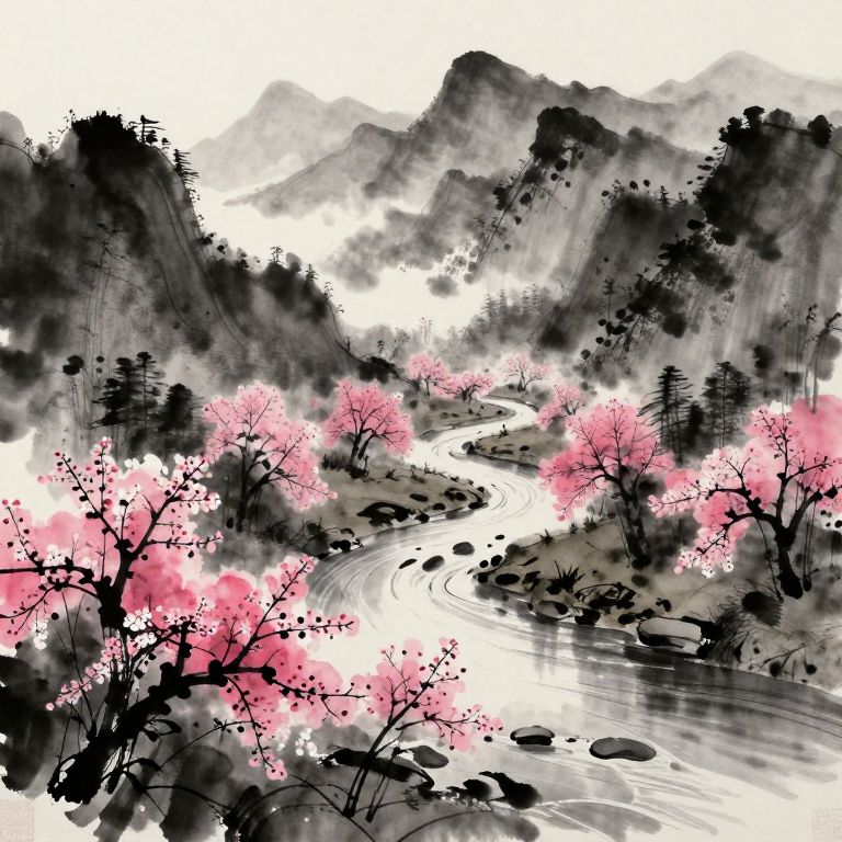 Digital painting of a serene mountain landscape with pink cherry blossoms, a winding river, and misty, dark mountains in the background.