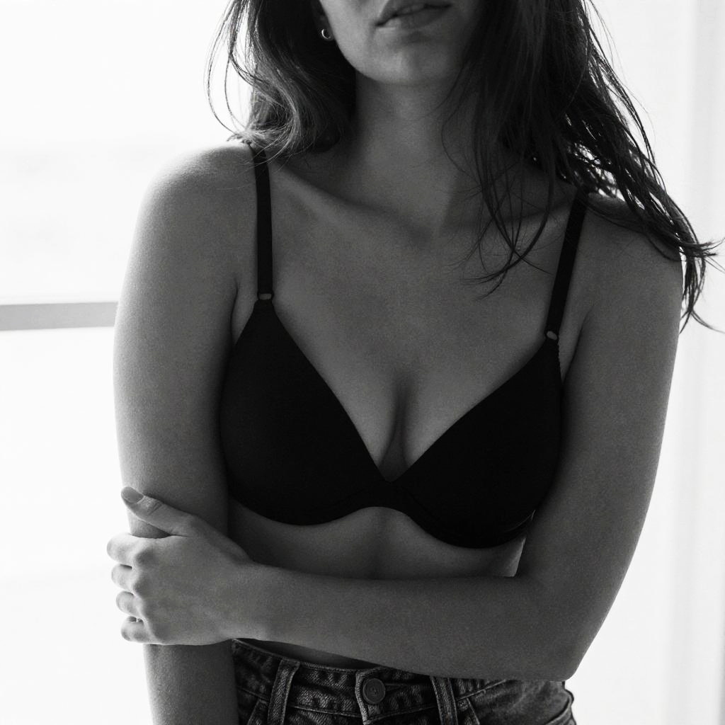 This is a high-contrast black and white photograph of a woman lying on her back against a plain white background. She has dark, wavy hair and is wearing a white bikini with a simple, smooth texture. Her eyes are closed, and her head is tilted slightly to the right. Her skin tone is medium to dark, and her body is toned and fit, with visible muscle definition in her abdomen and arms. The lighting emphasizes the shadows on her body, creating a dramatic effect. The overall composition focuses on her relaxed, serene pose, with the minimalist background drawing attention to her form.