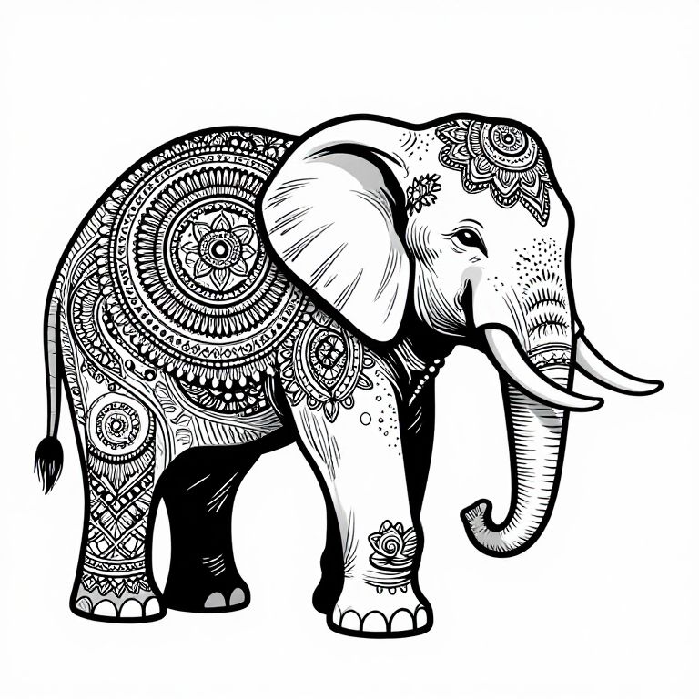 A detailed black and white vector illustration of an elephant adorned with intricate mandala patterns.