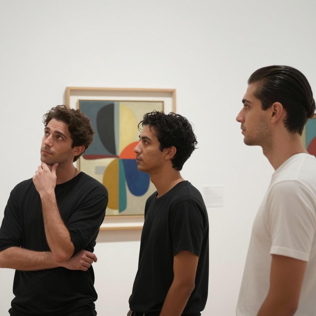 Three men in a gallery. Man on left with dark hair, black shirt, hand on chin, looking up. Man in center with dark hair, black shirt, facing left. Man on right with slicked-back hair, white shirt, facing left. Abstract painting with colorful shapes in background.