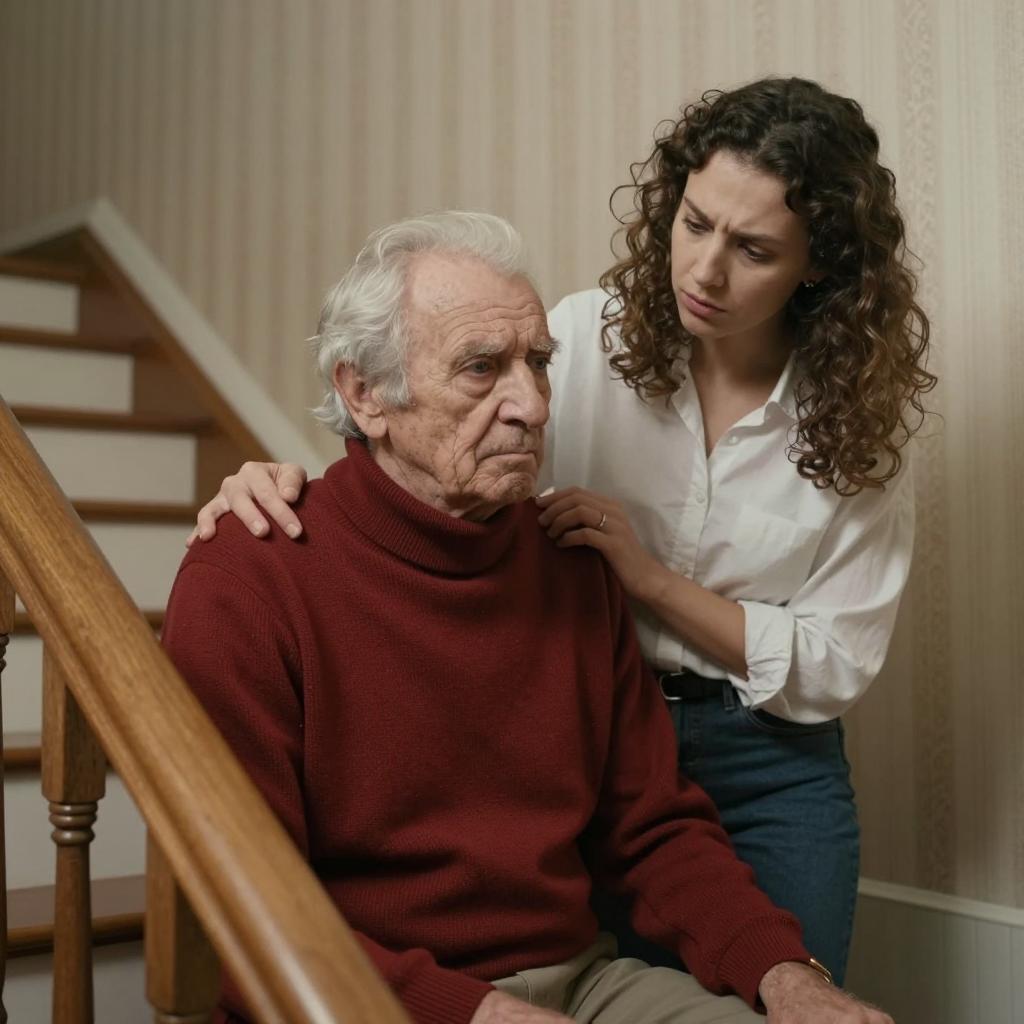 Two elderly people sitting on a beige couch. Man on left, white shirt, short sleeves, gray hair, serious expression. Woman on right, navy blue dress with white floral embroidery, short blonde hair, neutral expression. White wooden doors in background. Light-colored pillow on couch behind man. Both seated with arms resting on couch.