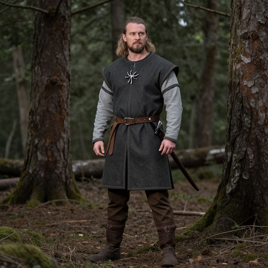 Medieval Woodsman Costume, man in a viking costume standing in the woods