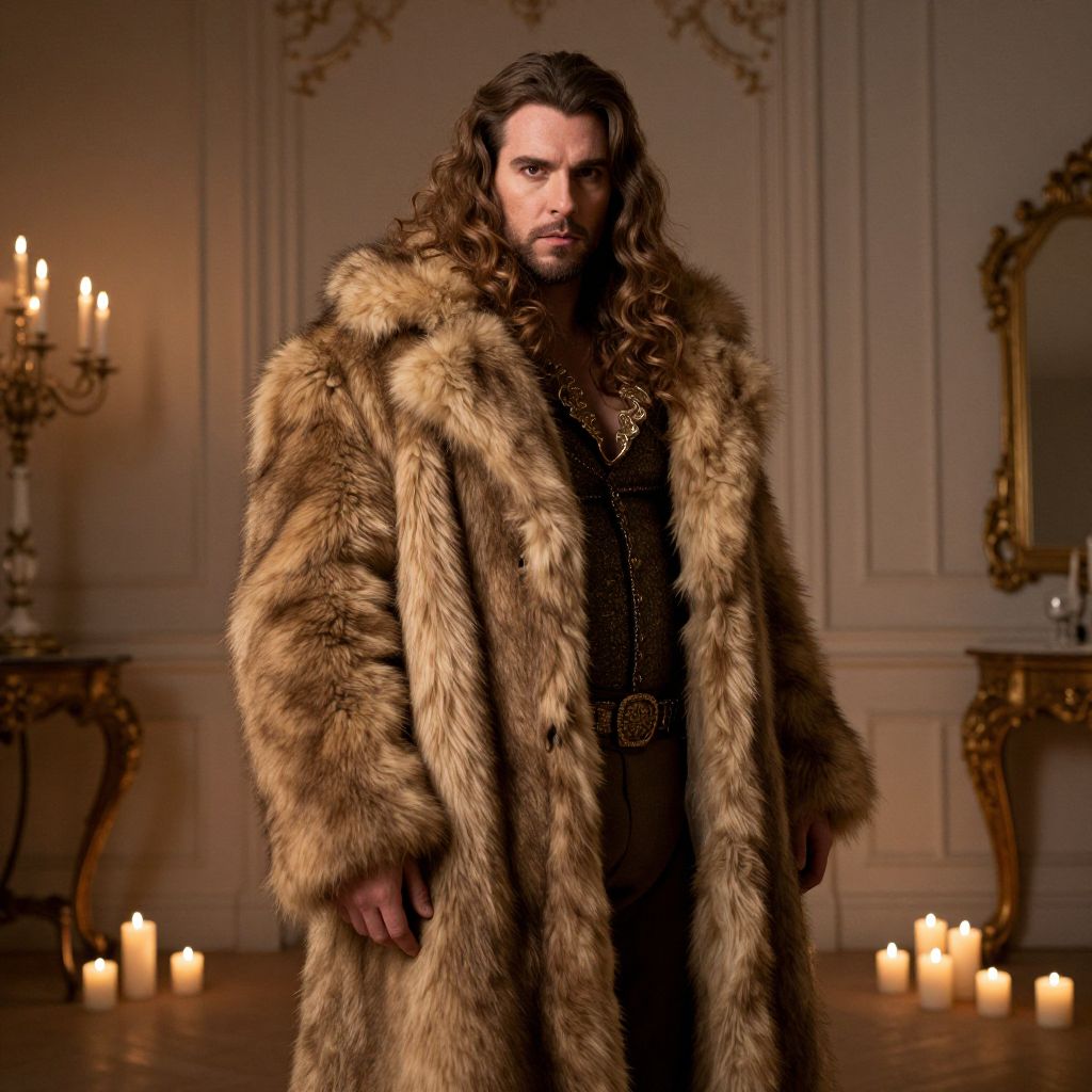 Photograph of a rugged, bearded man with long, wavy brown hair, wearing a luxurious, brown fur coat over a black, medieval-style tunic. He stands in an ornately decorated room with white paneled walls, a gold-framed mirror, and a candelabrum with lit candles on a wooden table to the left. Several candles are placed on the floor at his feet, adding a warm glow. The overall lighting is dim, highlighting the rich textures of the fur coat and the man's intense, serious expression. The room has a vintage, opulent feel.