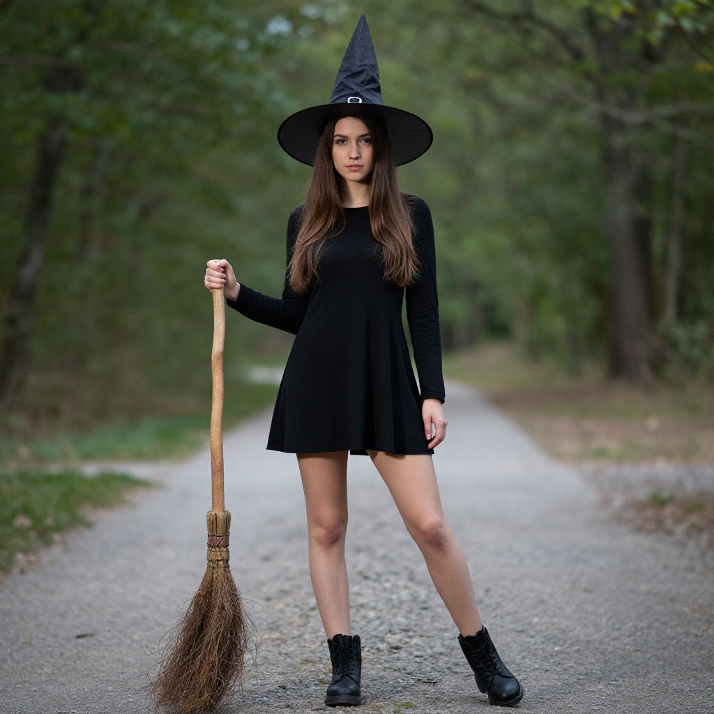Photograph of a young woman standing outdoors on a path, wearing a black long-sleeve dress, black boots, and a large black witch hat with a buckle. She's holding a traditional broom in her right hand. Her long brown hair flows down her shoulders. The background is blurred with green trees and a gray path, giving a magical forest vibe.