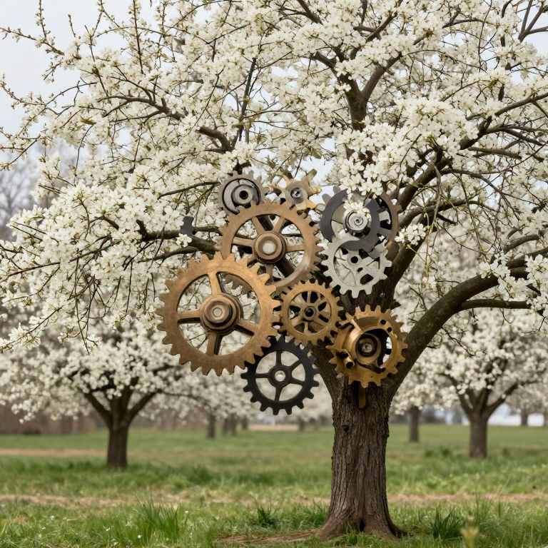 Photograph of a blossoming cherry tree in a grassy field. The tree's white flowers contrast with the dark brown trunk and branches. Superimposed on the tree are several large, interlocking metal gears in various sizes and colors, including gold and black. The gears are positioned in the center, partially obscuring the flowers. The background shows more cherry trees with similar white blossoms, creating a sense of depth. The overall image blends natural beauty with mechanical elements, highlighting the juxtaposition of nature and industry. The grass is lush and green, adding a vibrant base color.