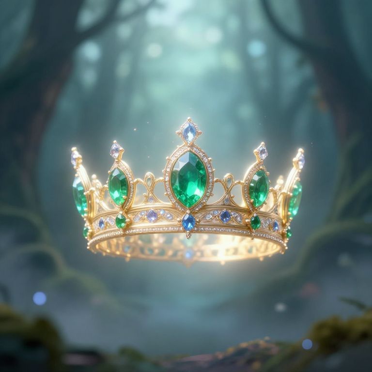A picture of a crown floating in a misty fantasy forest, glowing softly with magical energy, decorated with emeralds and sapphires, surrounded by faint sparkling particles and ethereal atmosphere, fantasy art style.