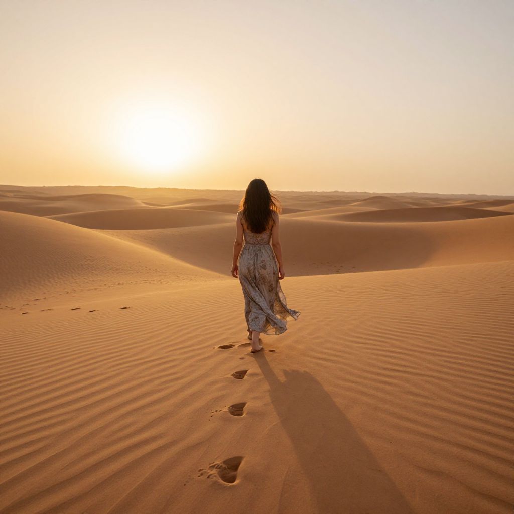 A woman walks away into the golden expanse of a vast desert, her flowing dress trailing behind as footprints etch the soft sand beneath her steps, capturing the serene beauty of solitude under the warm embrace of the setting sun.