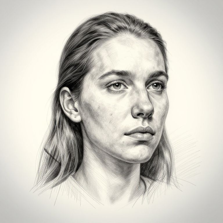 Black-and-white pencil drawing of a young woman with long hair, neutral expression, and soft lighting, set against a white background.