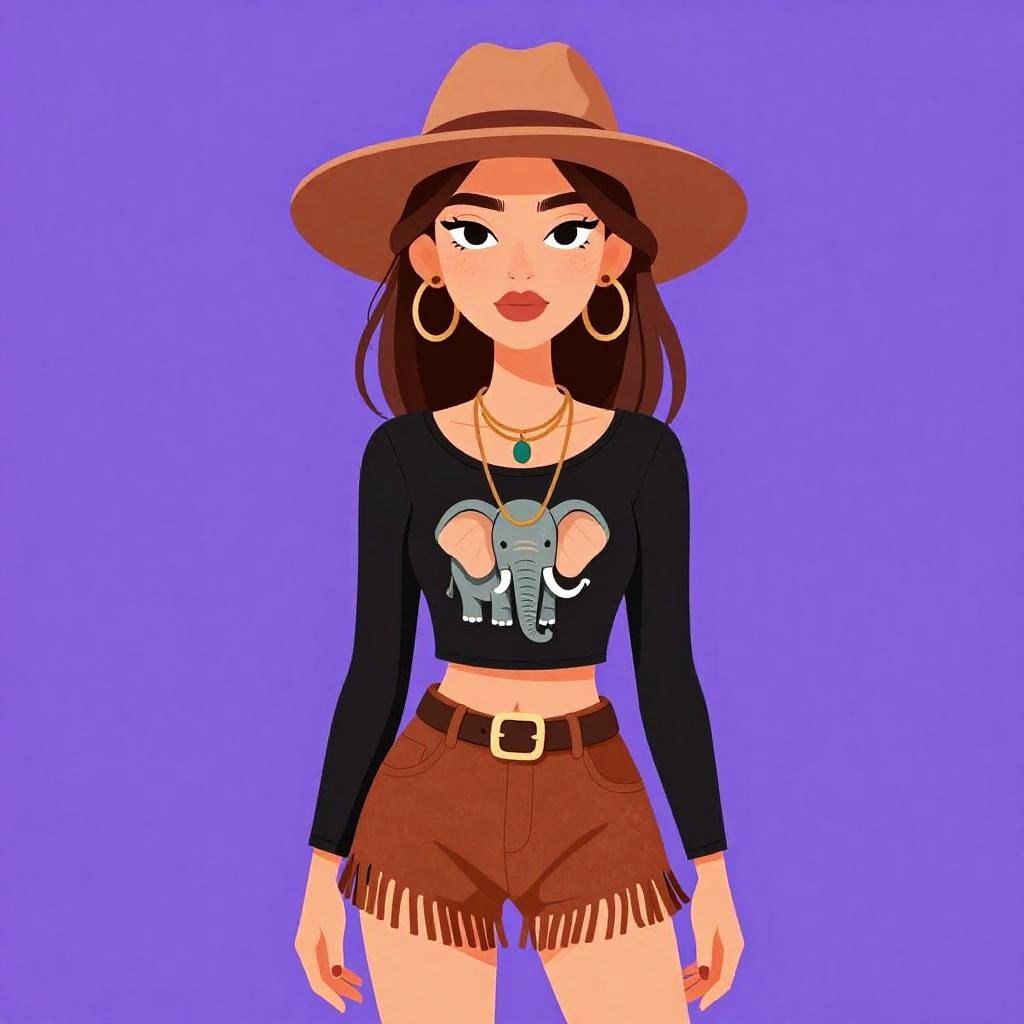 Digital illustration of a young woman with short brown hair, wearing a black tank top with an elephant, denim jacket, and tan shorts, against a purple