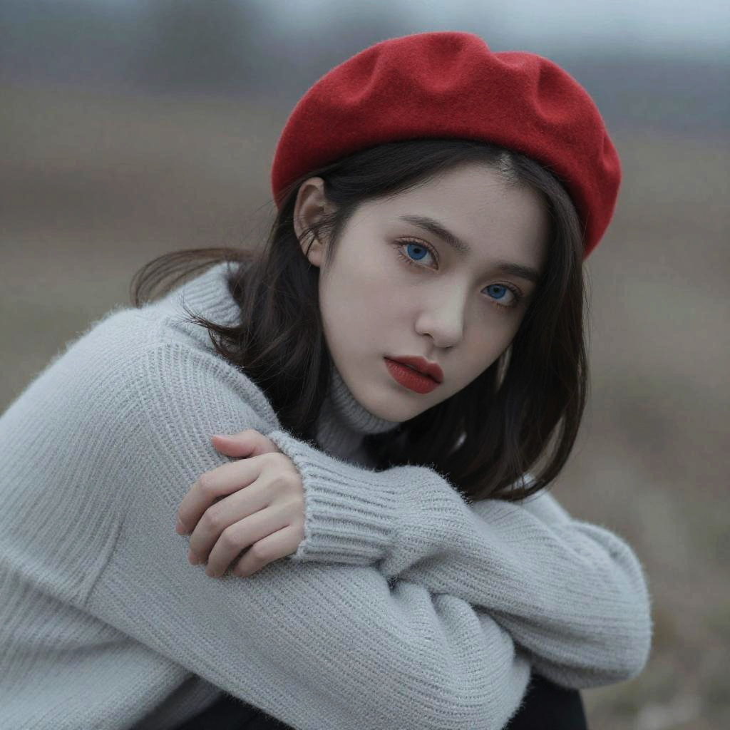 Photograph of a young woman with pale skin, blue eyes, and dark hair, wearing a red beret and a light gray knit sweater. She's leaning forward with her arms crossed, looking directly at the camera with a slightly melancholic expression. The background is blurred, with cool, muted colors, suggesting an outdoor winter setting. Her red lipstick contrasts with the soft, monochromatic tones of her outfit and the background.