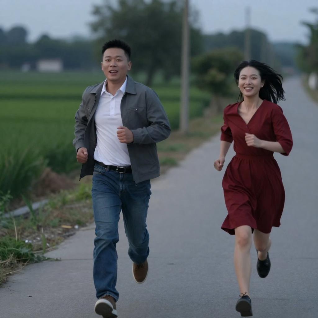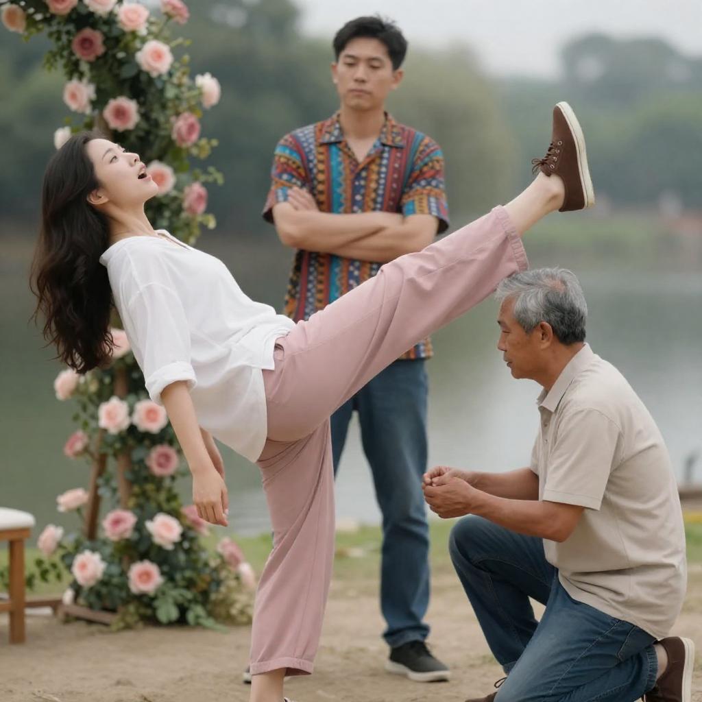 Photograph of three people outdoors. Woman in white shirt and pink pants, head tilted back, legs raised. Man in colorful patterned shirt, arms crossed, standing behind her. Older man in beige shirt, kneeling, adjusting her shoe. Floral arch with roses in background. River and trees in background. Woman's expression is open-mouthed, others neutral.