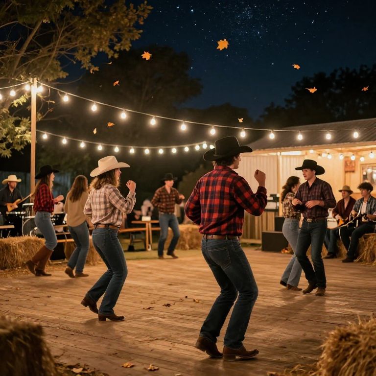 Outdoor hoedown party under starry night, people dancing on wooden floor, plaid shirts and cowboy hats, string lights hanging from trees, hay bales around, country band playing, warm glow, festive and energetic mood with autumn leaves fluttering