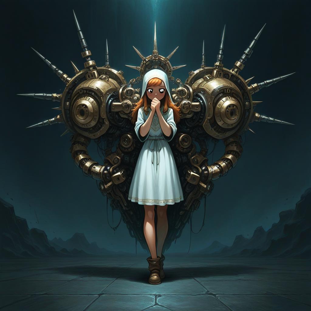 Woman, fine white clothes, curiosity. Cute, shy, expressive eyes, full body shot, dark eyes, ancient mechanical devices in the background, Emily Balivet, Tim Blandin, James C. Christensen, Carne Griffiths, (1girl, portrait:0.5)