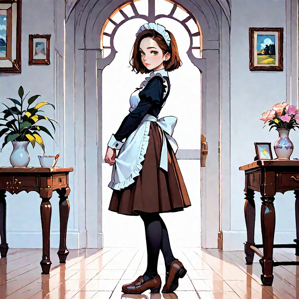 Digital illustration of a full-body anime-style young woman dressed in a classic maid uniform, featuring a brown dress, white apron, and maid headdress. She has short brown hair, green eyes, and is looking towards the viewer with a worried expression. The character is standing sideways holding a towel, set in an elegant hotel room with wooden furniture, potted plants, and framed paintings on the walls.