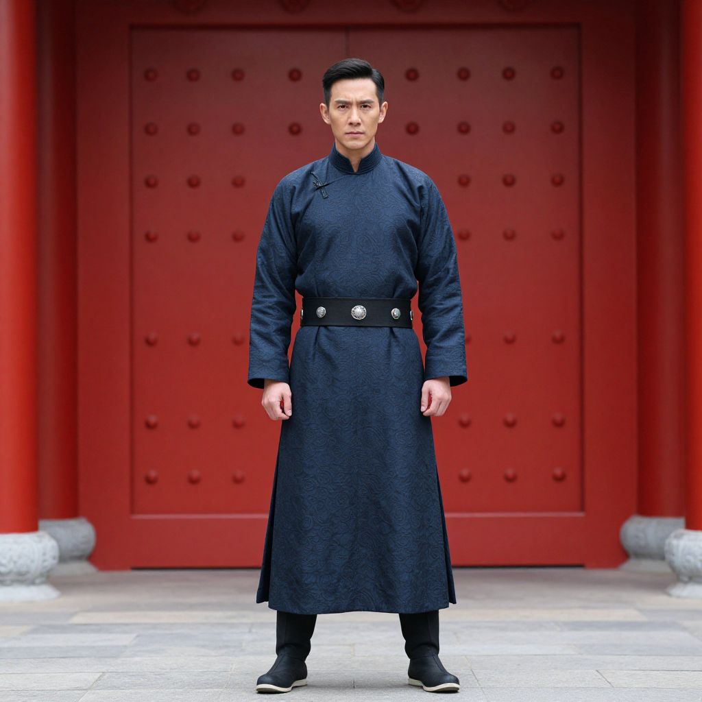 Man Shang Chi Wenwu Costume, man in a chinese dress standing in front of a red gate