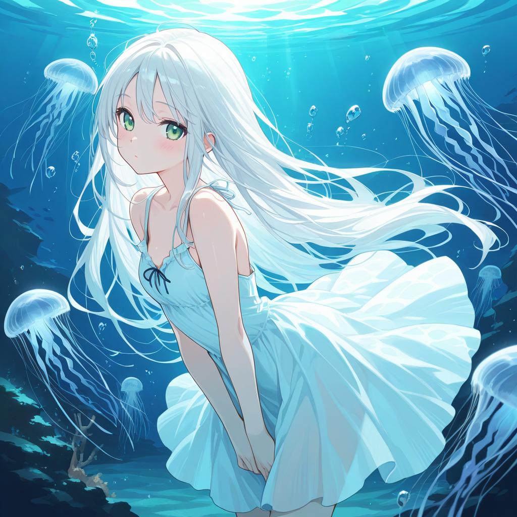 Masterpiece, (best quality), (1girl), solo, (high contra BREAK 1.2), (high saturation:1.2), ((hands on the pocket)), ((black and white sdress)), looking at viewer, ((white and light blue theme:1.3)), ((white and light blue background:1.5)), white hair, blue eyes, ((walking:1.3)), full body, black footwear, ((the light blue water on sky and white cloud and day)), ((from above:1.2)), Ink painting