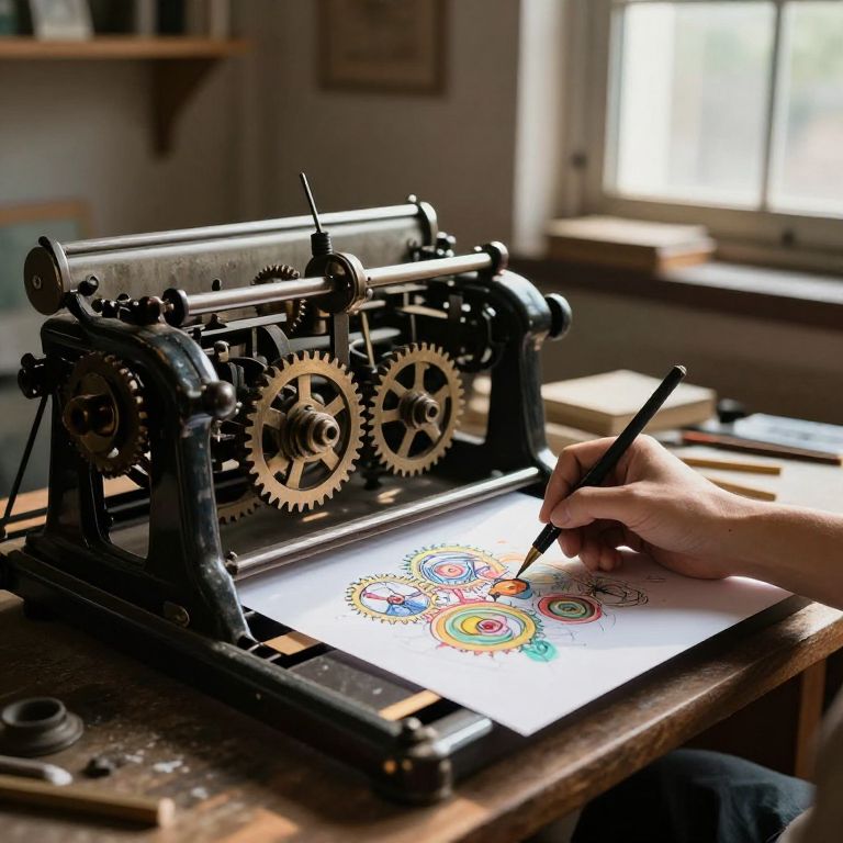 Draw something generator shown as a vintage mechanical drawing machine in an old-fashioned artist’s studio, gears and levers turning while colorful sketches appear on paper, warm sunlight filters through dusty windows, blending nostalgic aesthetics with creative energy.